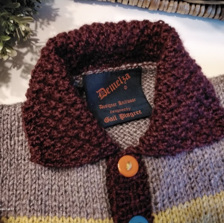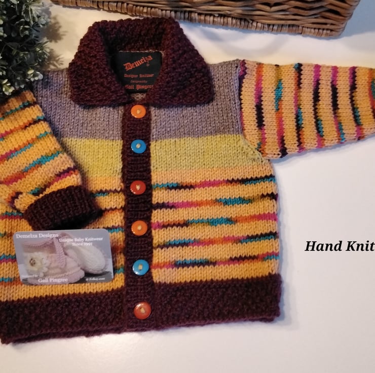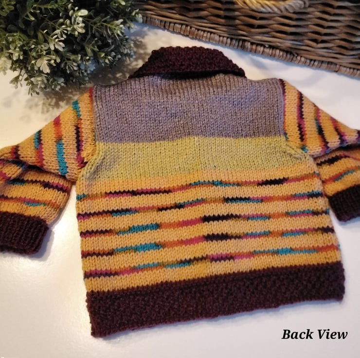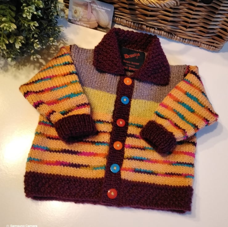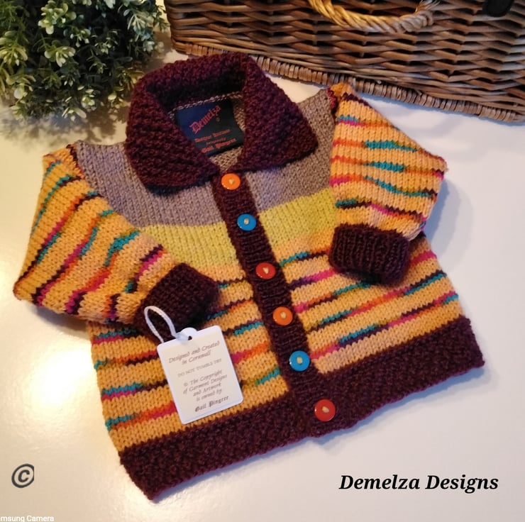 A very unique baby cardigan designed and totally hand crafted in Cornwall using a mix of quality machine washable premium acrylic knitting yarns set at low temperatures settings. The buttons are a mix of colours picked out in the yarns used adding an extra design dimension to the finished item.