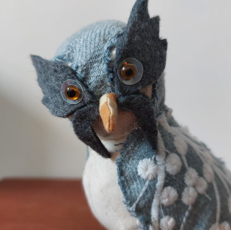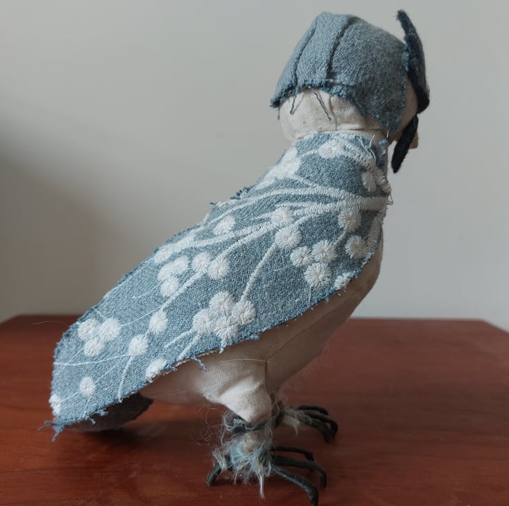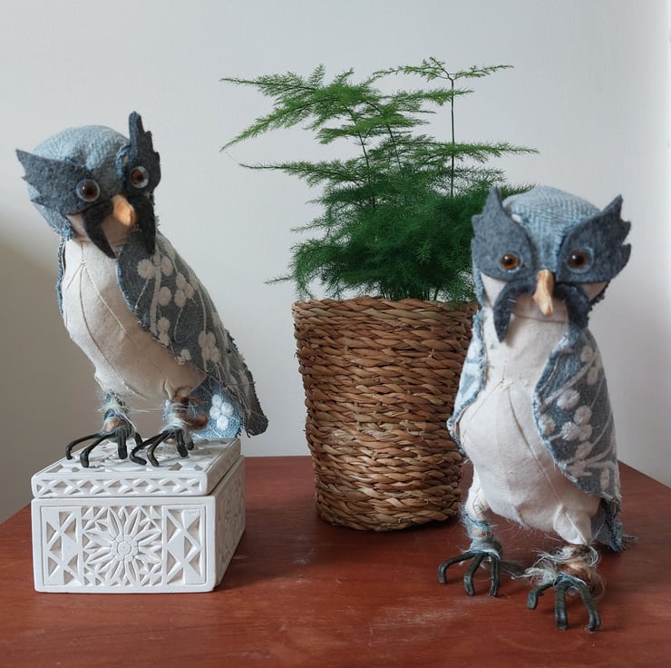 I've given these little birds of prey big mustaches to mimic those of the Peregrine Falcons that nest in The Tamar Valley, or maybe the smaller Hobbys that hunt in the surrounding fields. Free standing soft sculpture. Approx 17cm height