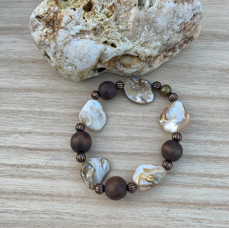 Using gorgeous shell Rhombus nuggets, combined with wood beads and antique brass beads, made on strong superior stretch cord. This easy to wear natural looking bracelet will fit between 7inch and 8 inch wrists comfortably.