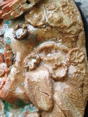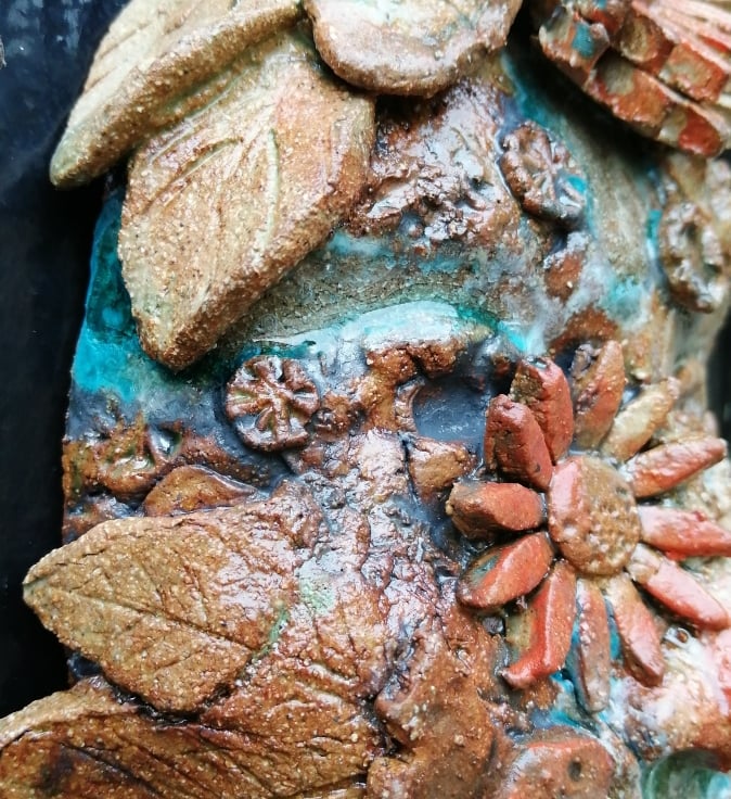 This wall piece has been made by using a variety of pottery techniques such as press moulding and hand modelling, using casts of seed heads, texturing with found materials and incorporating imprints of real plants dependent on the season.