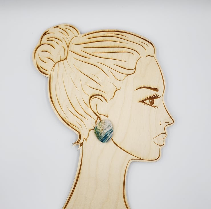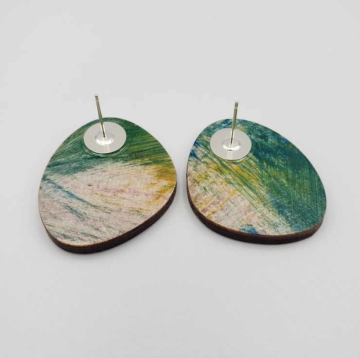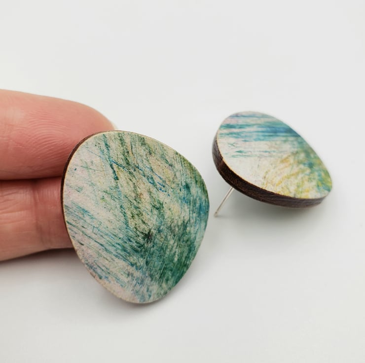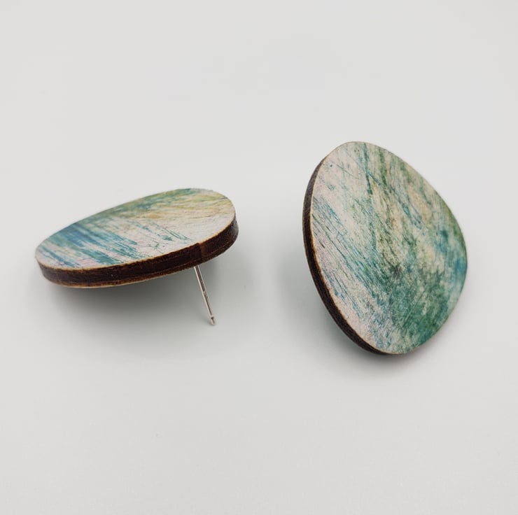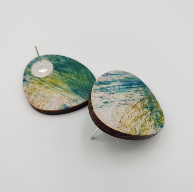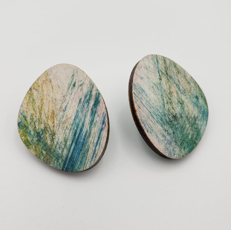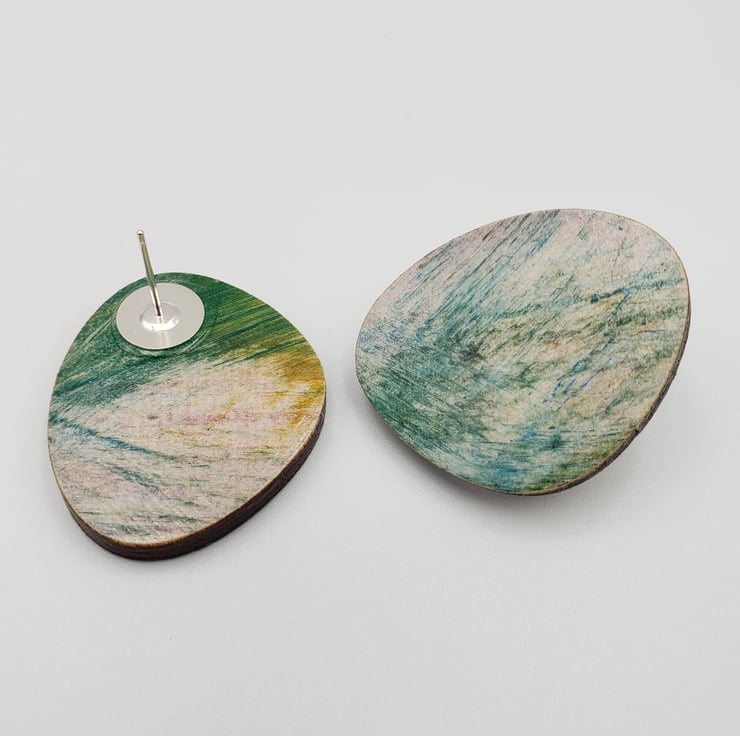 Pebble shaped stud earrings in my scribble print design. Predominantly green and white with a hint of pink. These are a gorgeous shape and very light to wear, the posts are sterling silver and come with sterling silver butterfly backs and rubber ones, so you can choose which ones you prefere.