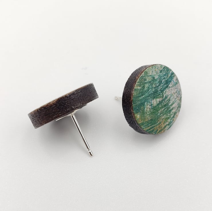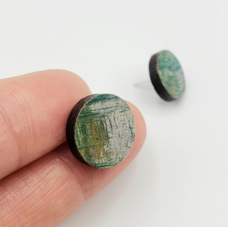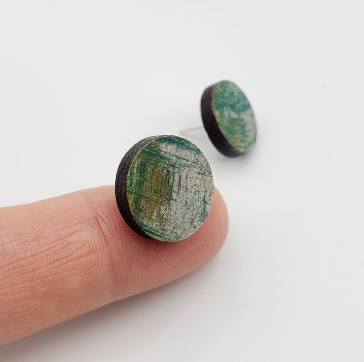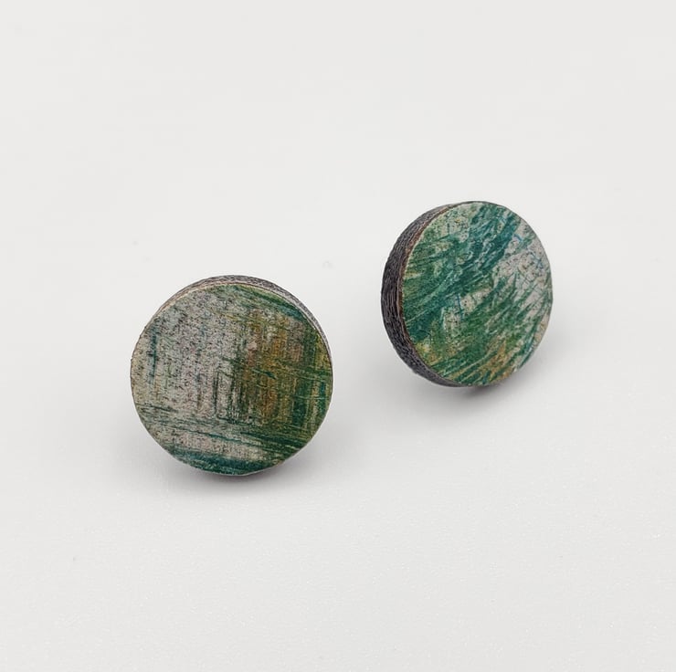 Small round stud earrings in an abstract scribble print design. Greens, white and matt gold, they have silver plated backs, including free rubber backs as an alternative to the Sterling silver butterflies.
