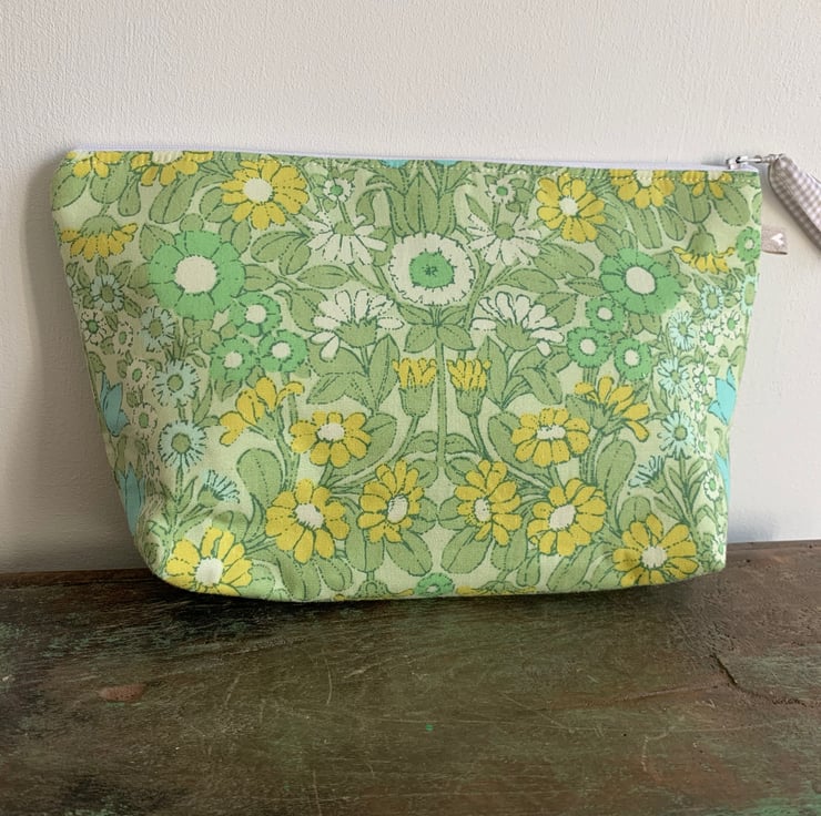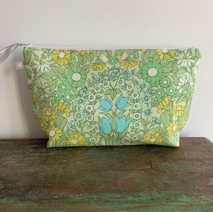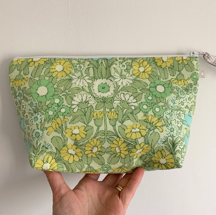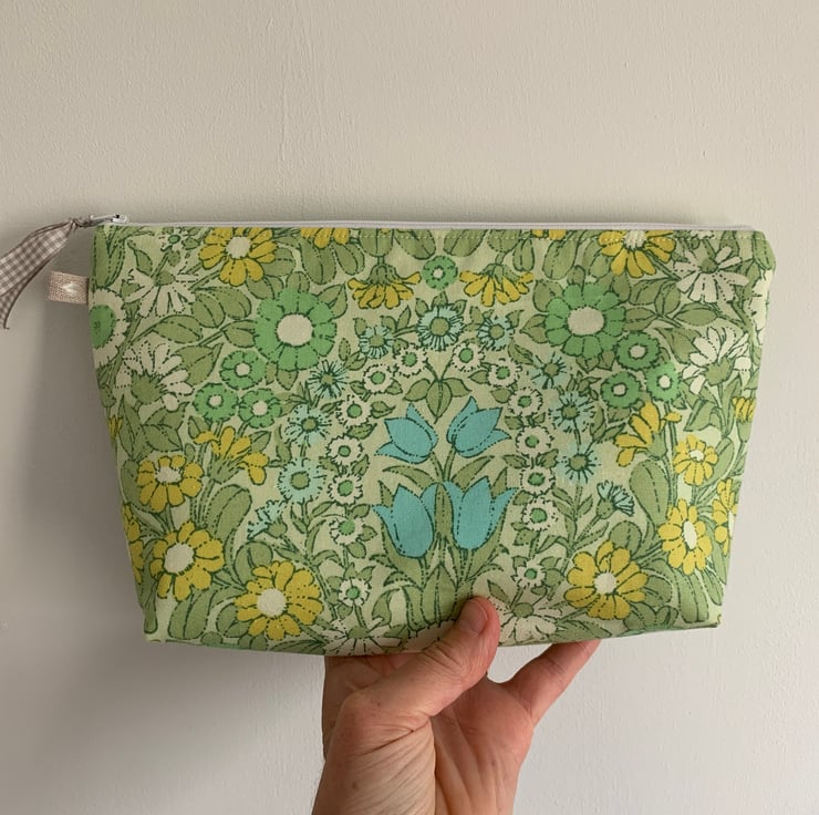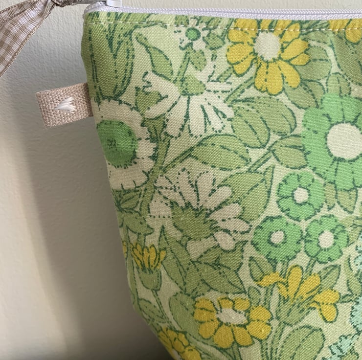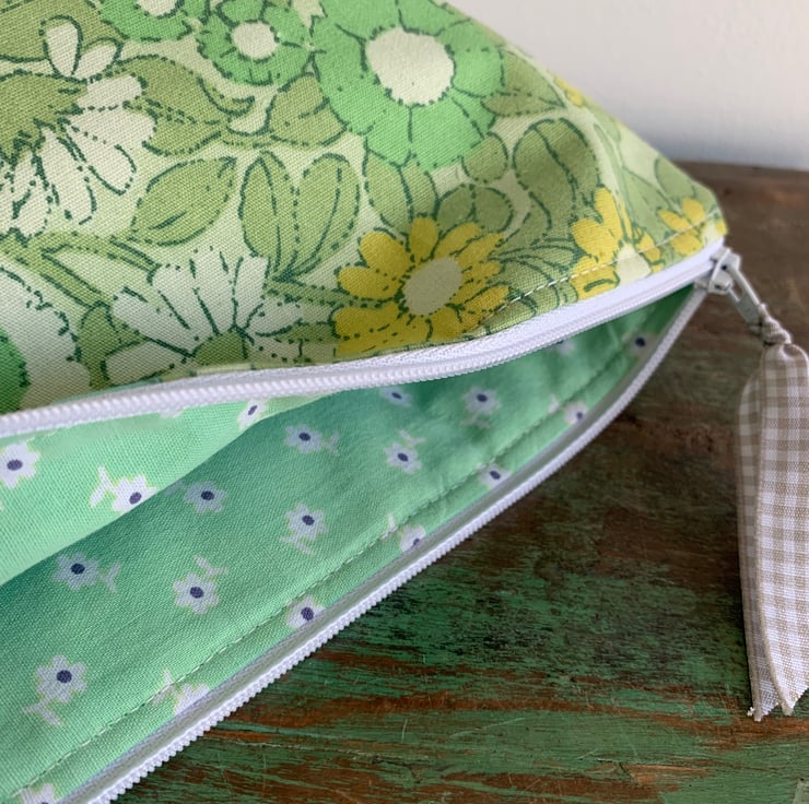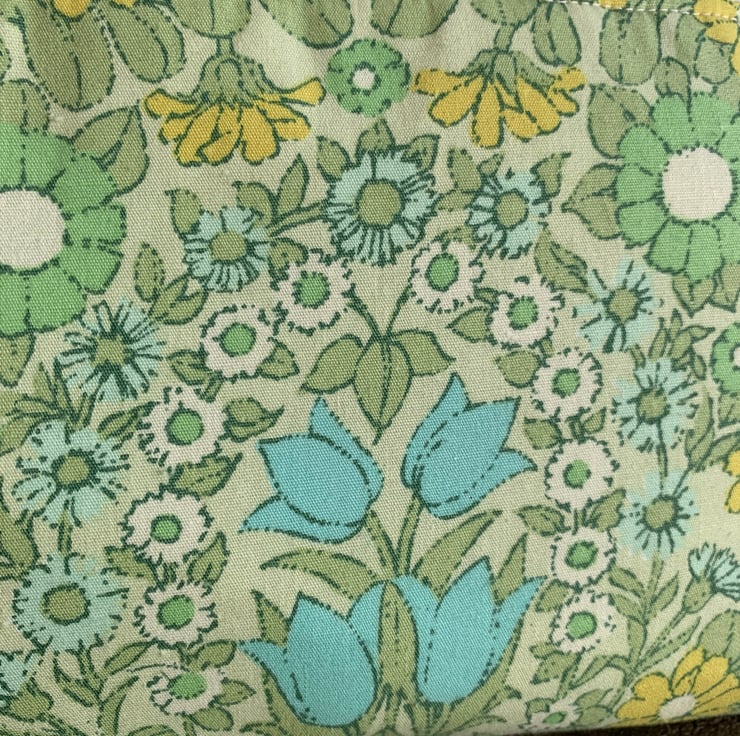 This pretty floral cotton is Daisy Chain by Jonelle Duracolour from the 1970s. It was designed by Pat Albeck. The bag is lined with reclaimed green cotton sheeting with a small flower pattern and there is a layer of interfacing between the layers.