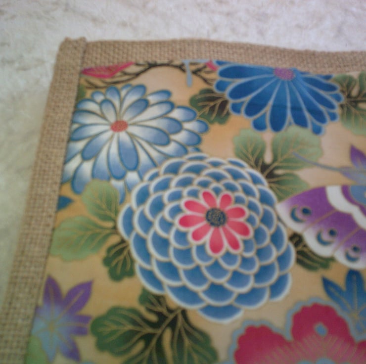 The bag itself measures approximately 22 x 20 x 13 cm (9 x 8 x 5 inches). The fabric pocket - which has been hand sewn onto the bag has a design of butterflies and flowers on a dark cream background.