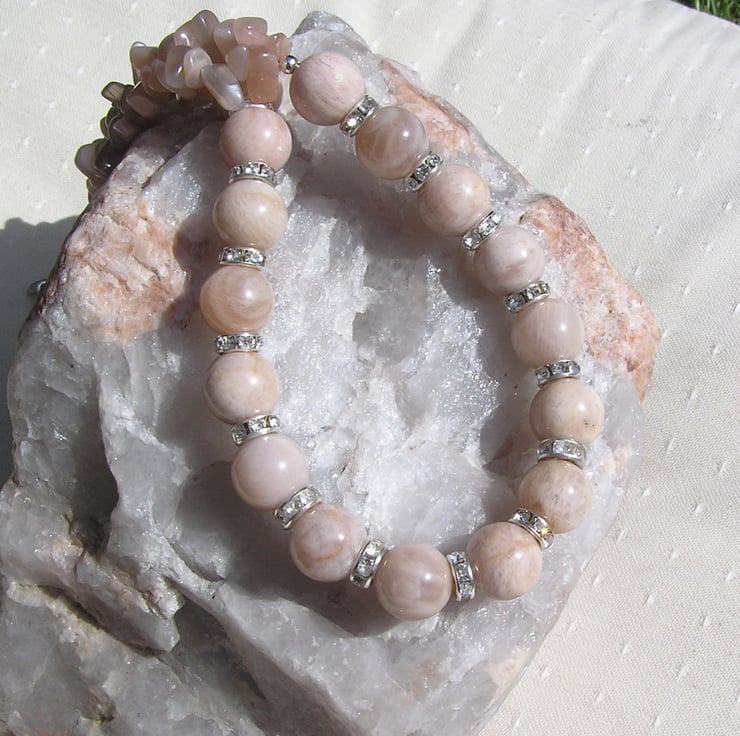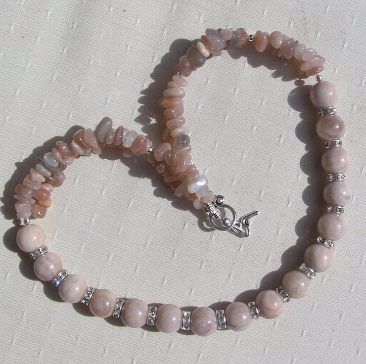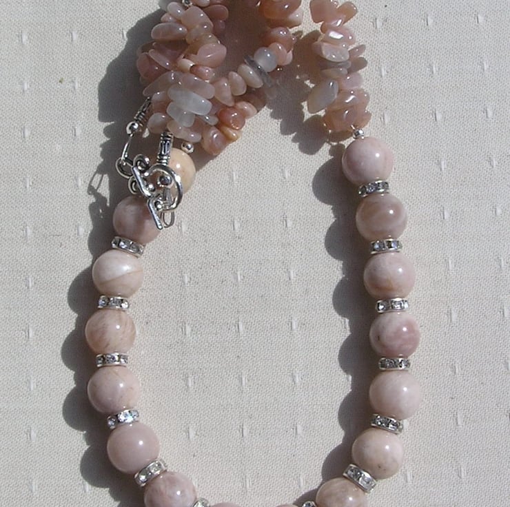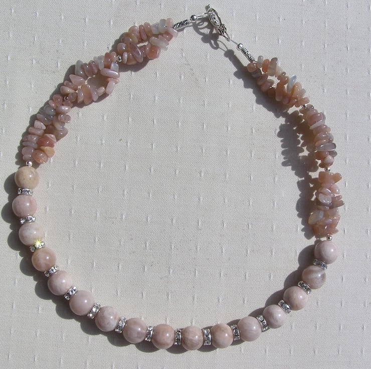 This Stunning Necklace is made wholly from Sunstone - Chunky Round Beads alternated with Glistening Crystal studded spacers which then flow into double-stranded Sunstone Gem chips - a Gorgeous warming effect that will look stunning either worn casually or with something more Elegant for a Special Evening out