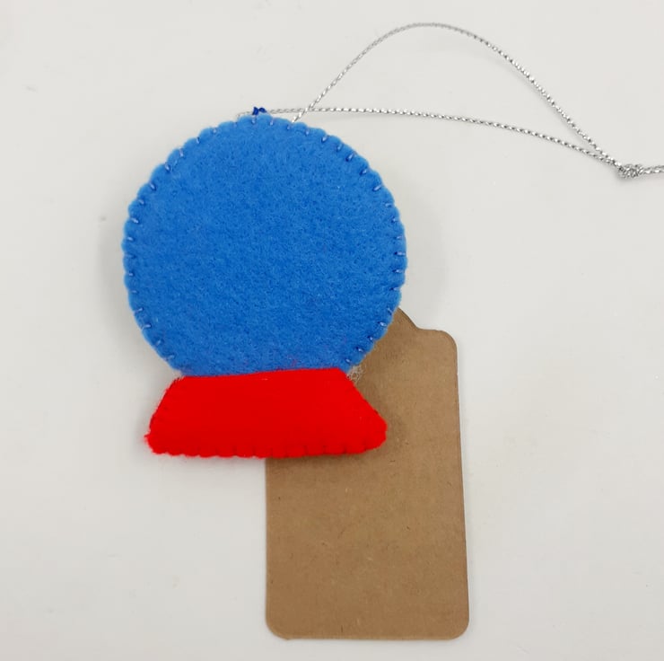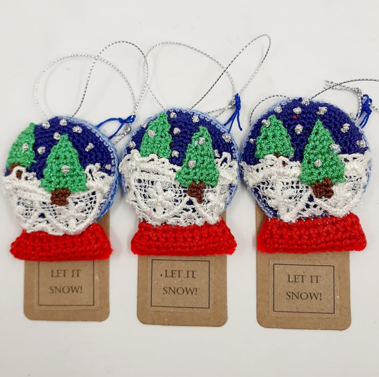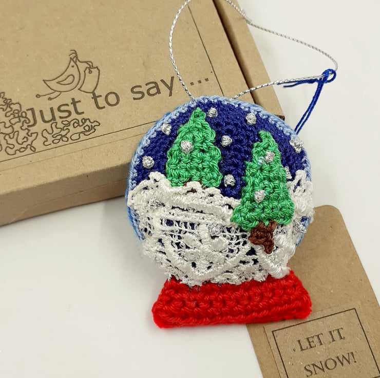 This sweet little tree decoration is crocheted in cotton and embroidered with a silver lamé thread. The dark blue background and the trees have a subtle sparkle. The settled snow is made from a snippet of cotton lace. There is a circle of card in the globe section which is also domed using a polyester filling. The decoration is backed with craft felt and hands from a silver loop. The globe measures approximately 6 cm in length from the top of the globe to the bottom of the red base.