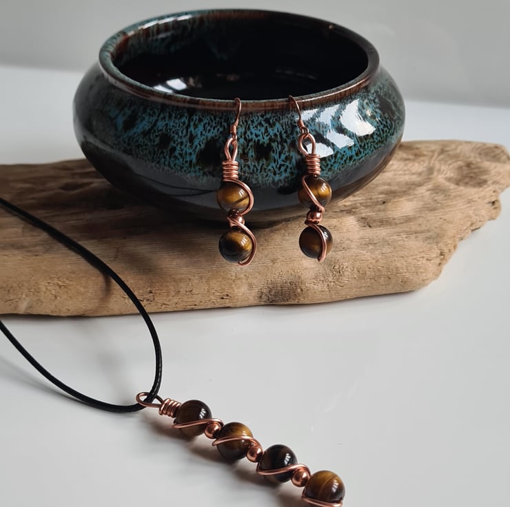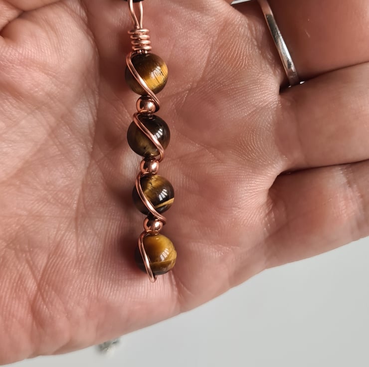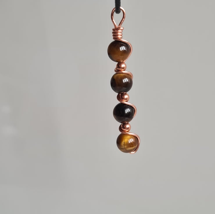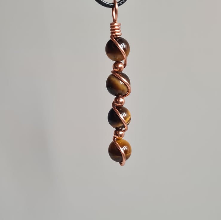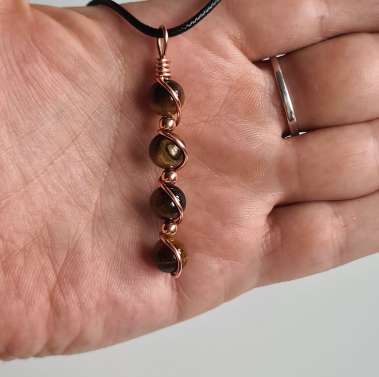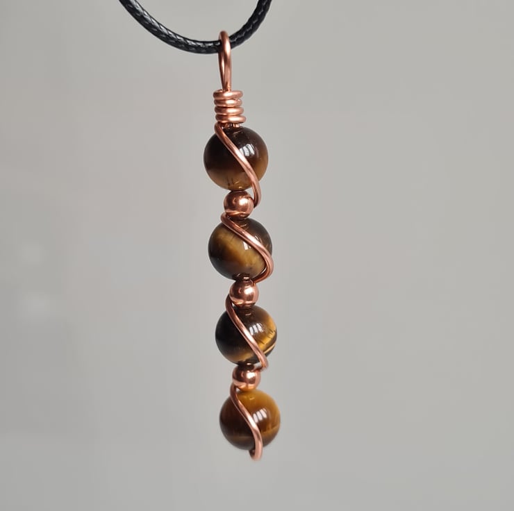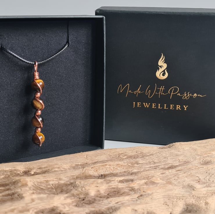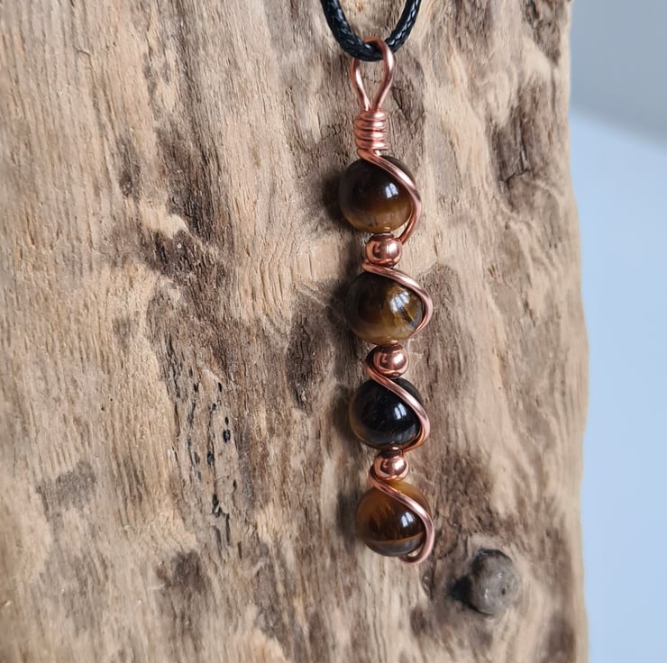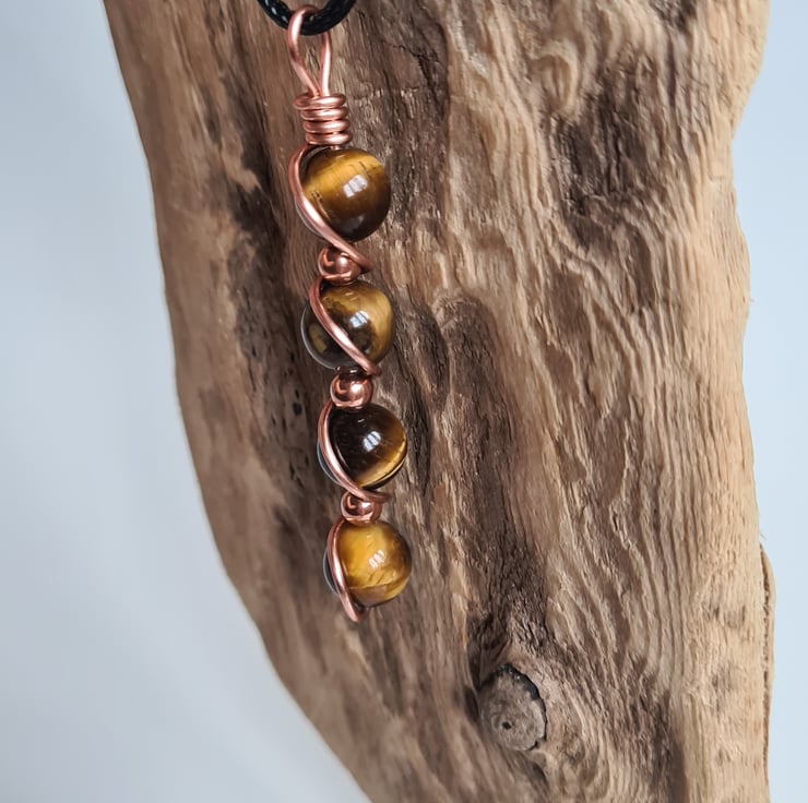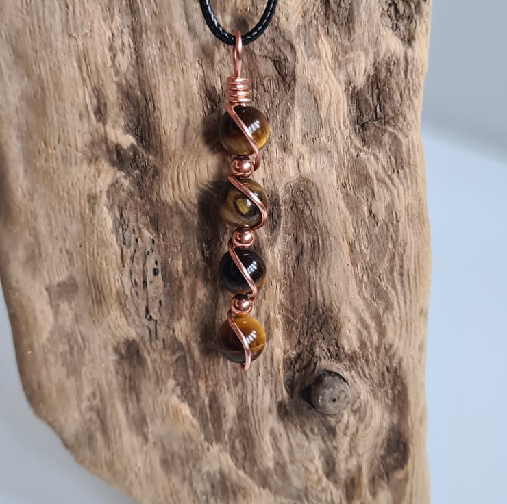 I have wrapped these beautiful Natural Tigers Eye & copper beads in copper and the pendant comes on an adjustable black cord necklace and gift boxed.