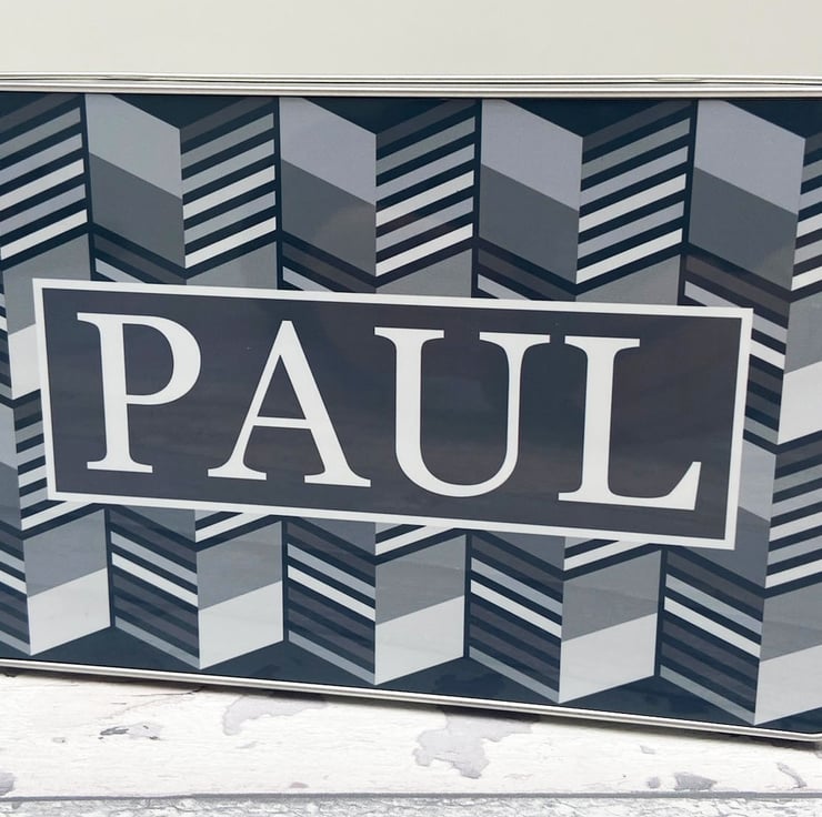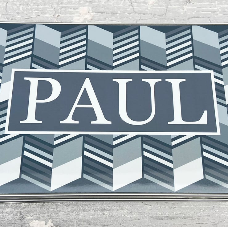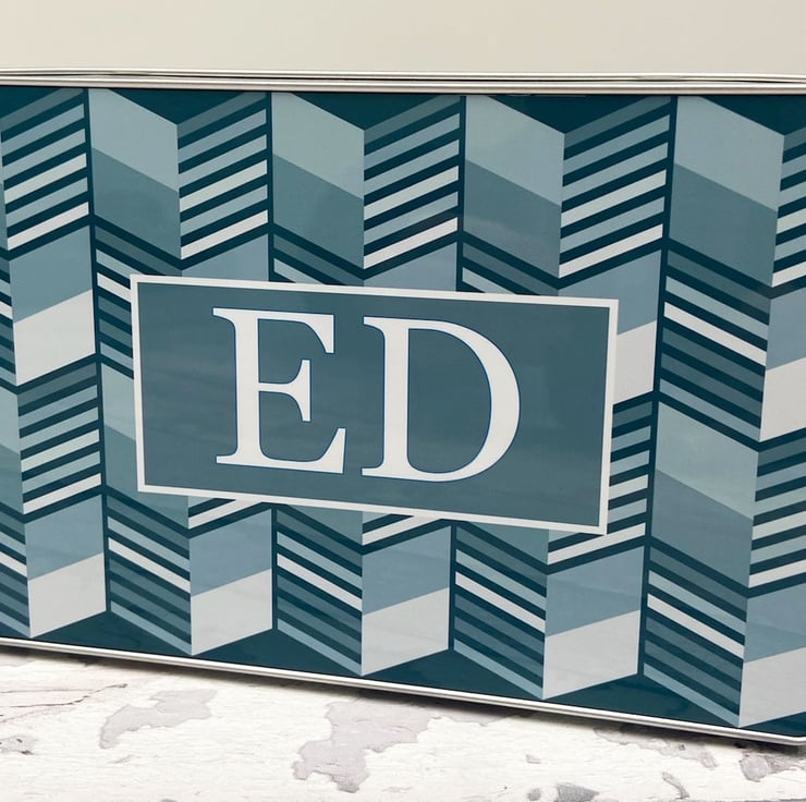 This design was created digitally using Illustrator. I have created a geometric pattern using shapes in tones of one colour. I have then added a name to personalise. Each design in then individually printed onto a metal insert using a heat press in my home studio in Cheshire.