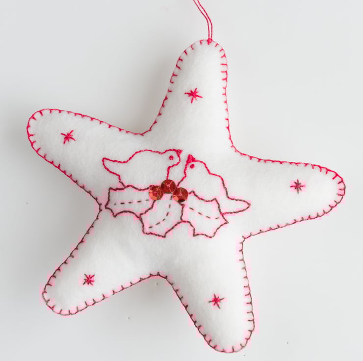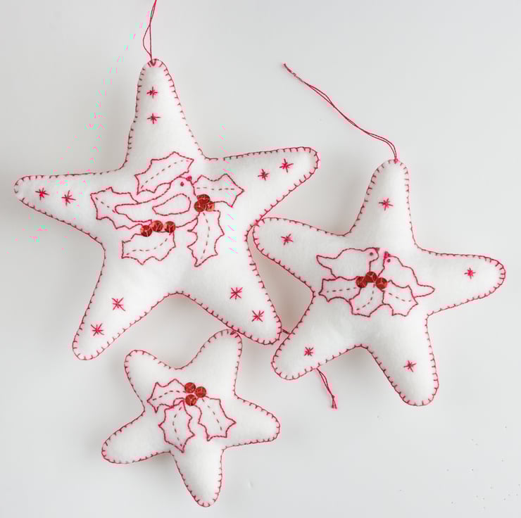 White wool felt always makes me thing of snow and white and red are the ultimate Christmas classic. I have many small wool felt Christmas stars that I've stitched over the years and enjoy taking them out each December and adding them to my own tree - a feeling I know many other people enjoy in their own Christmas traditions. Every now and then, I make some decorations to add to my shop so they can become part of another home's annual traditions.