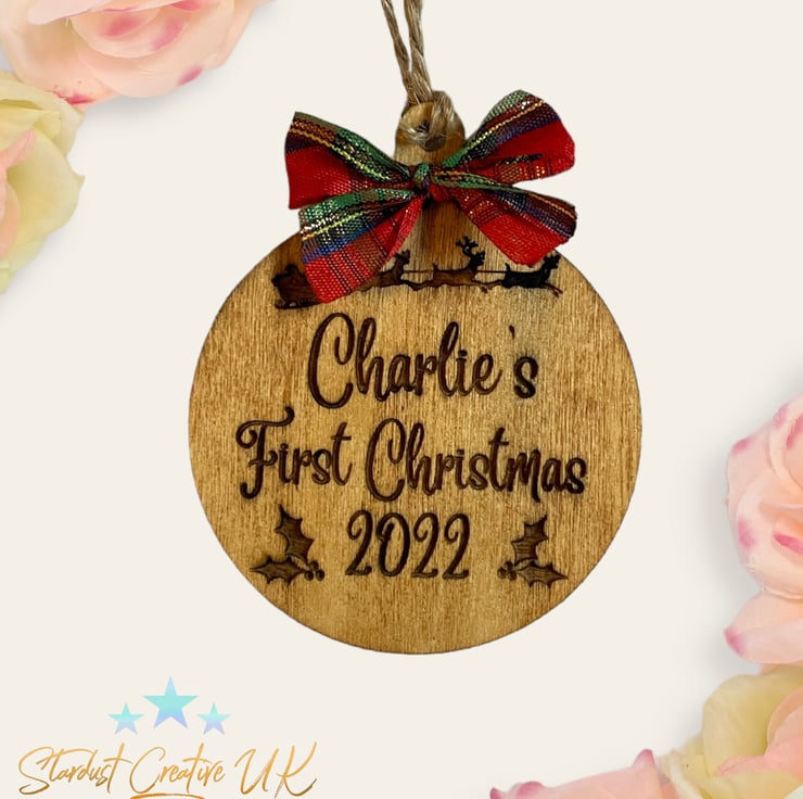 Design shows says “Charlie’s First Christmas 2022” with Santa and reindeers flying along the top and two holly leaves at the bottom.