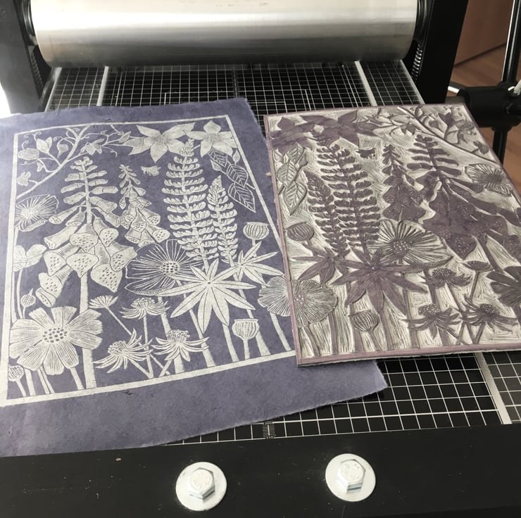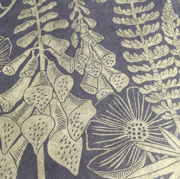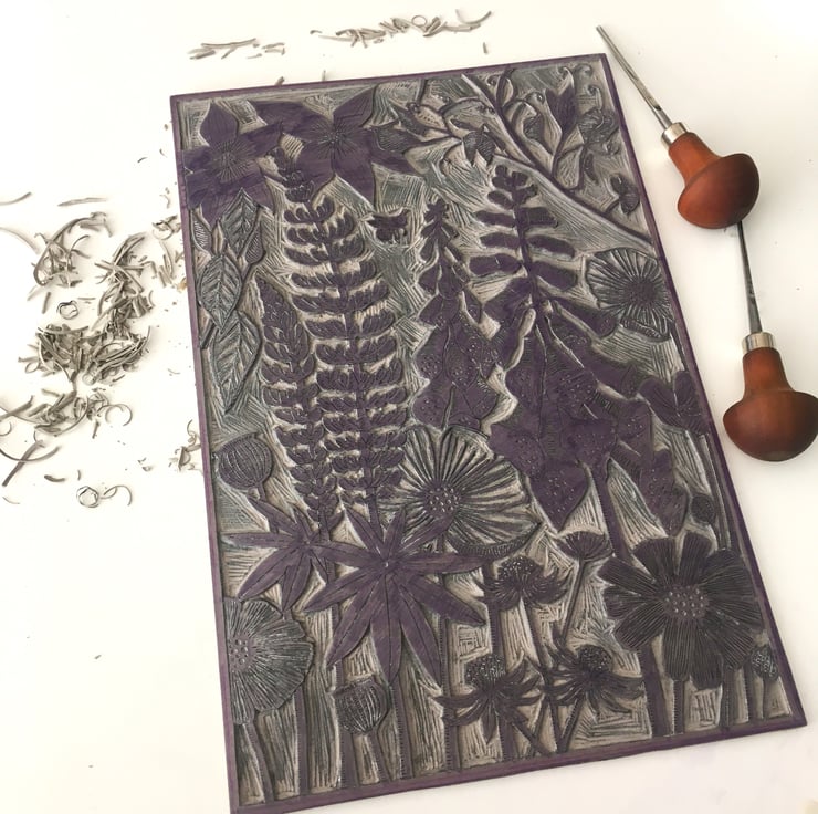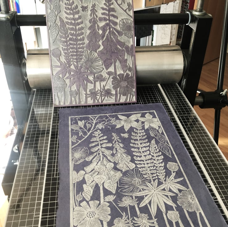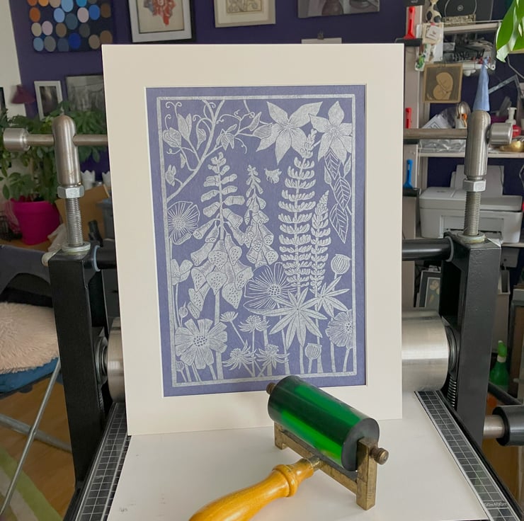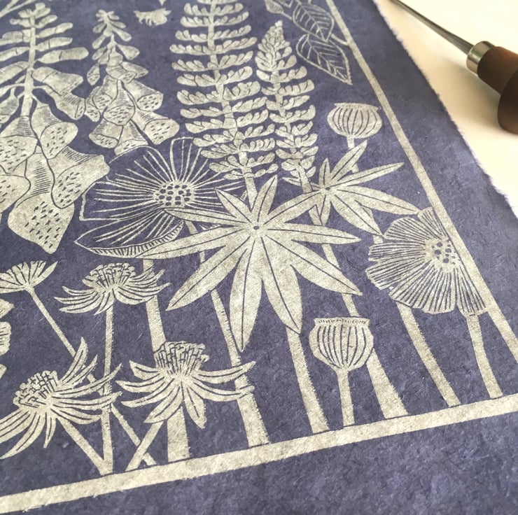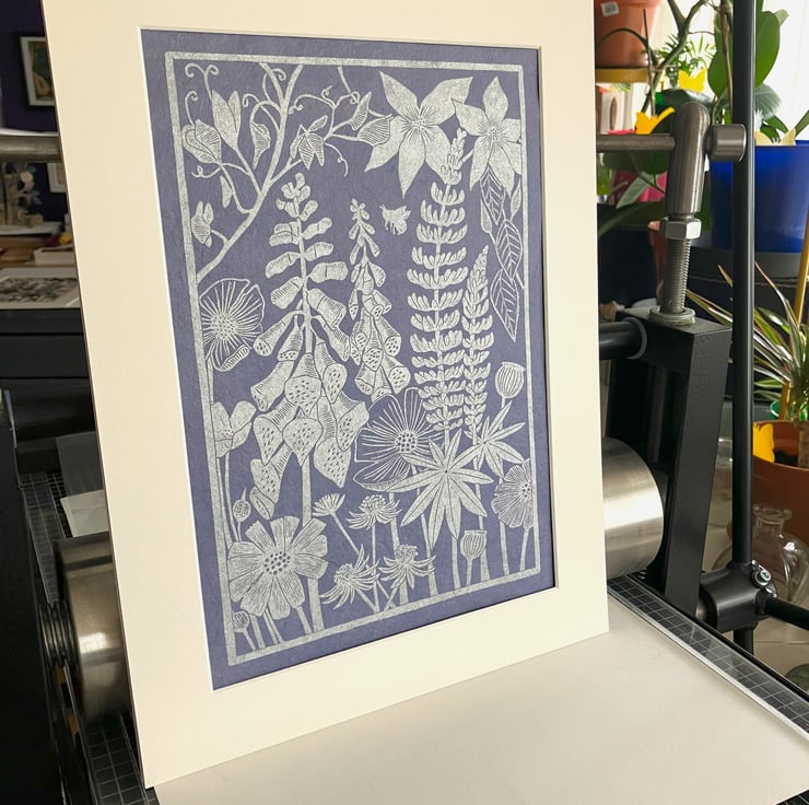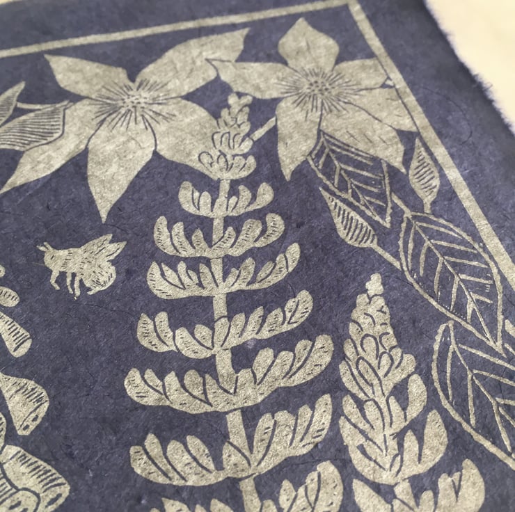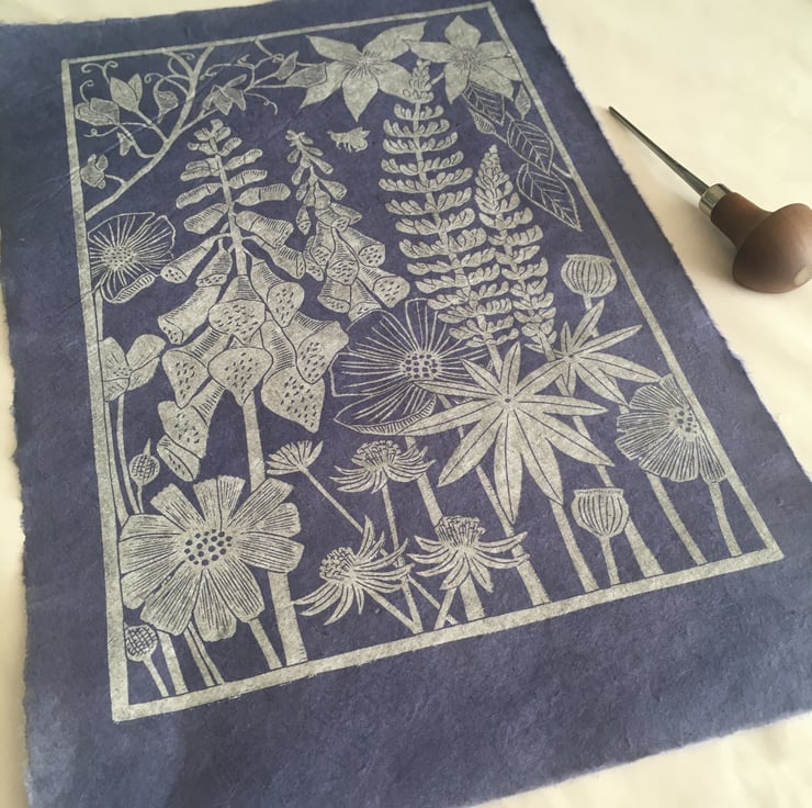 I've long wanted to do a linocut print including all my favourite cottage garden flowers and I have finally done it! This print features Lupins, Foxgloves, Daisies, Clematis and Sweet Pea amongst others and of course a busy little Bumble Bee.