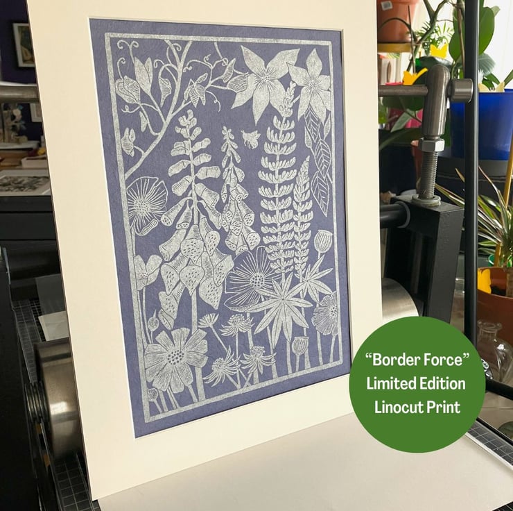 "Border Force" is a handprinted, limited edition linocut print. Linocut printmaking involves first drawing the image and then transferring in reverse onto artist's lino. The image is then carved using V and U shaped to form a printing block. Ink is then applied to the block with a roller and the paper placed face down ontop of the block. I then use my etching press to lift the print.