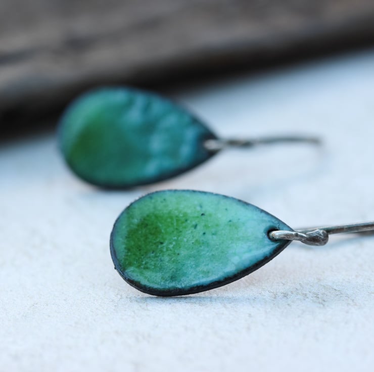 These teardrop earrings have been handmade from copper sheet, then enamelled with powdered glass.