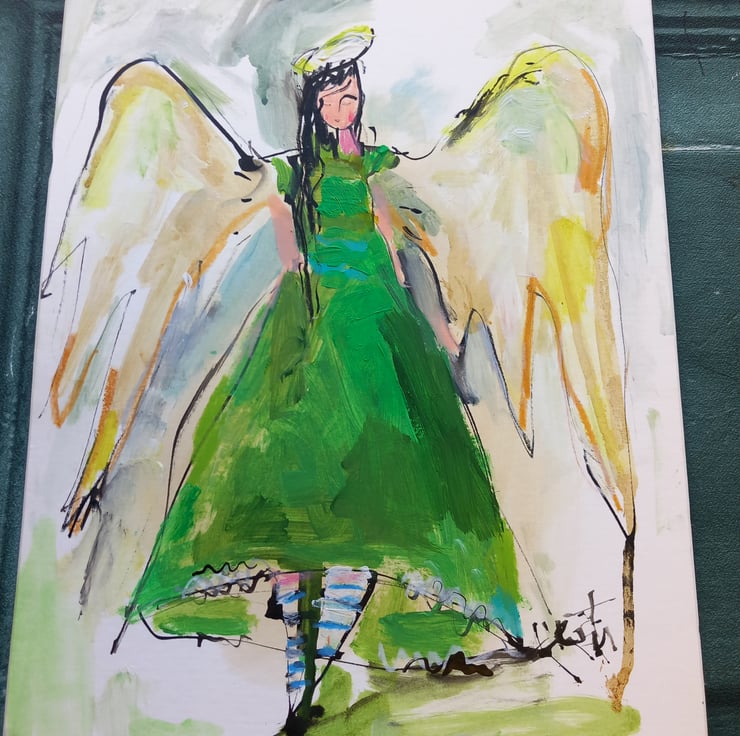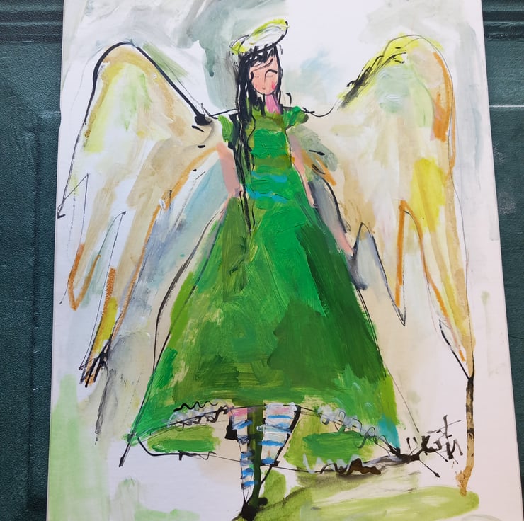 A free spirited angel, one off original not a print. On thick card, unframed. I used Indian ink first to keep a loose and flow. 36 cm tall. 27 wide. Would be lovely framed. You could have her dll year round as not to christmassy