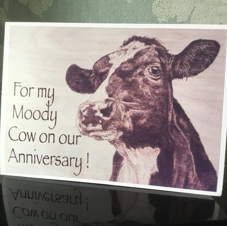 Moody cow anniversary card.