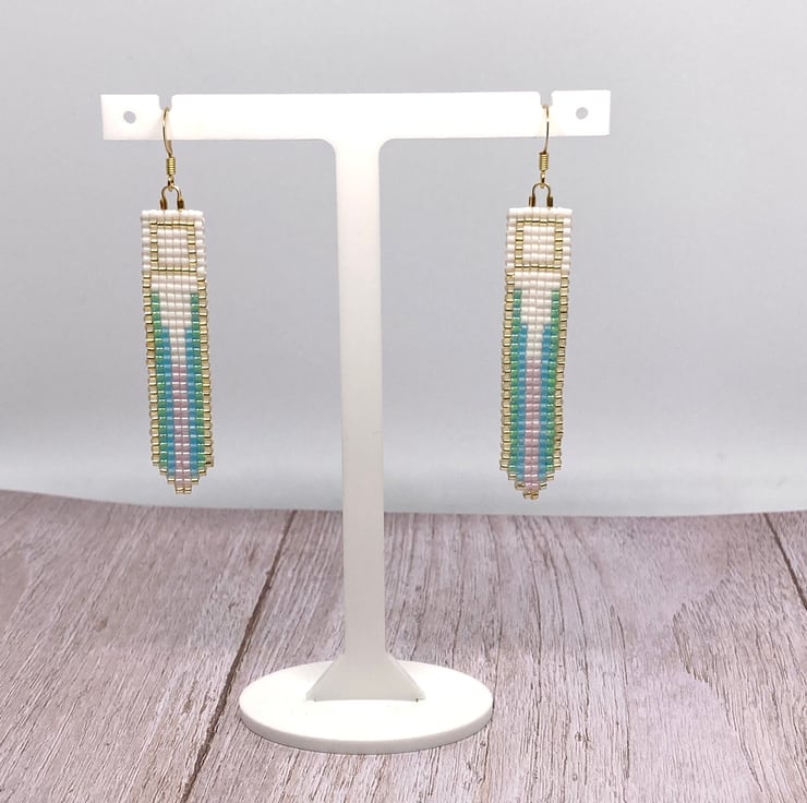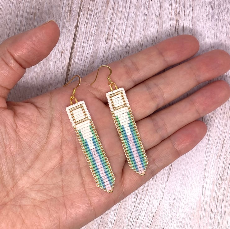 Hand woven beaded earrings using cream, lilac, green, blue and gold coloured Miyuki delica glass seed beads.