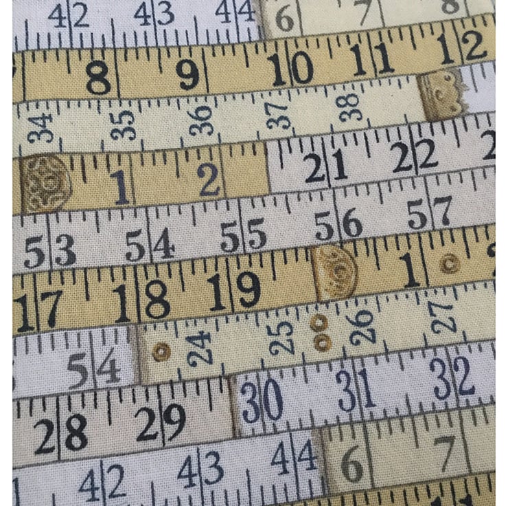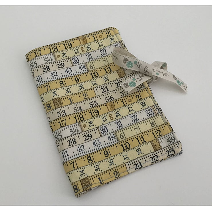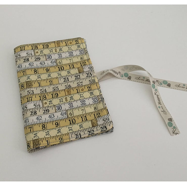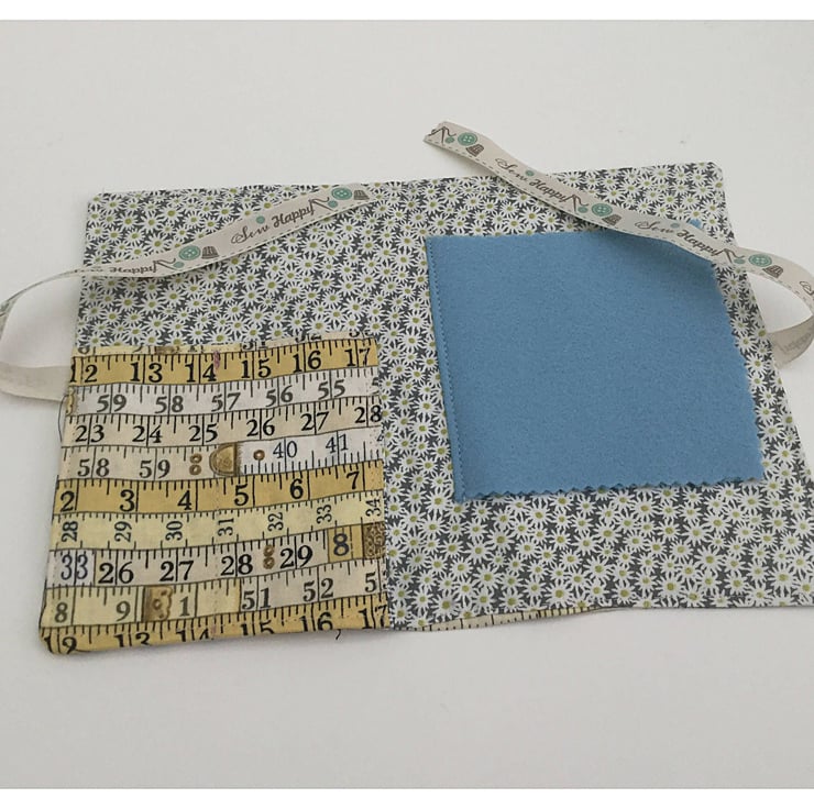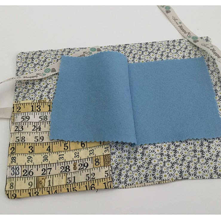 This lovely case features a front fabric of yellow and cream tape measures. The inside has a matching pocket to store scissors and there are 2 pale blue felt flaps to keep your needles and pins tidy. The inside lining fabric consists of a yellow and white daisy fabric.