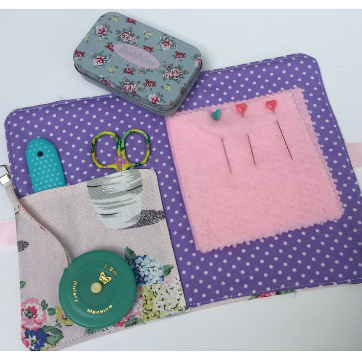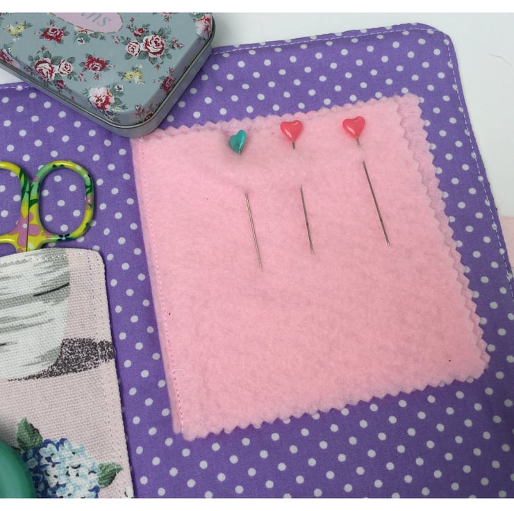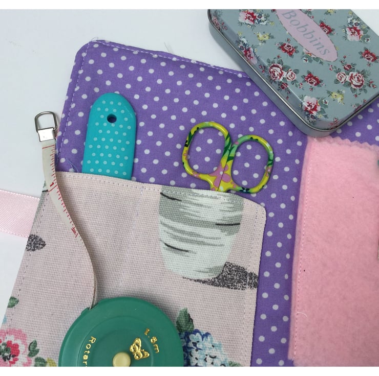 The inside has a matching pocket to store scissors and there are 2 pale pink felt flaps to keep your needles and pins tidy. The inside fabric is a contrasting lilac print with tiny white spots.