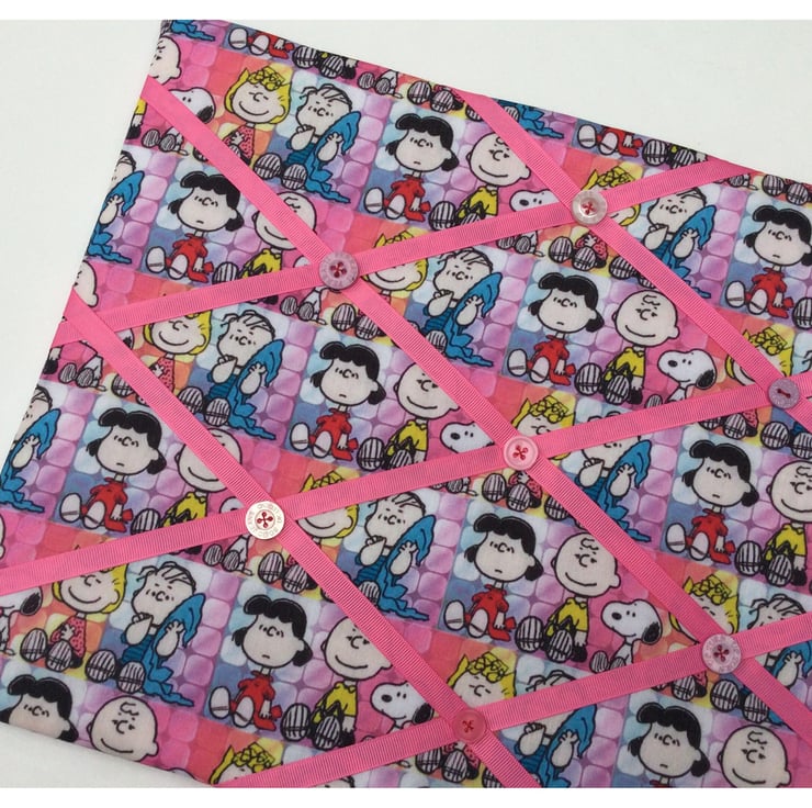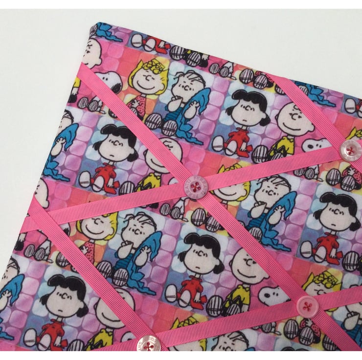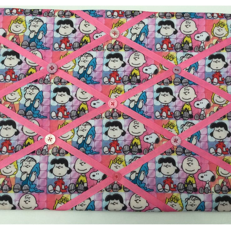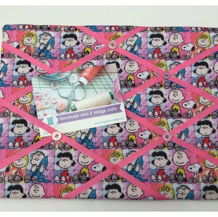 A lovely handmade memoboard, made from a fun Snoopy and Peanuts fabric, featuring the main characters.