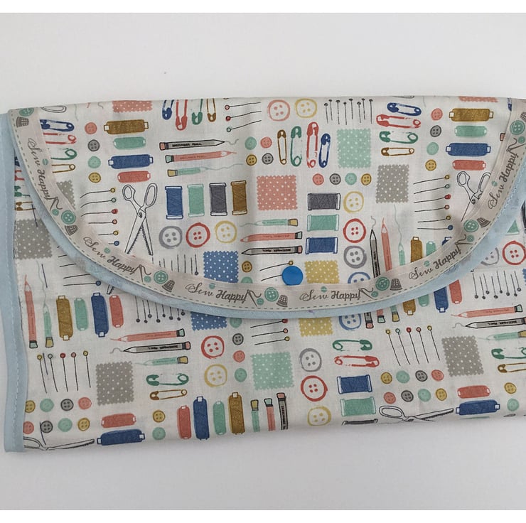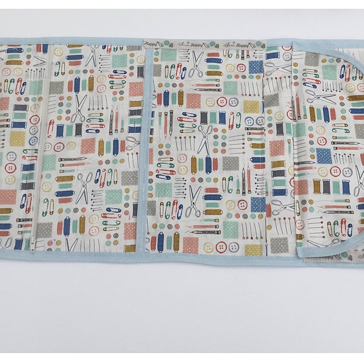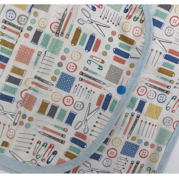 Plus it is all finished with a neat pale blue bias binding. There are royal blue snap fastening buttons to keep everything safe. Plus a ribbon with the words "sew happy" on the outside front and 2 sections inside.