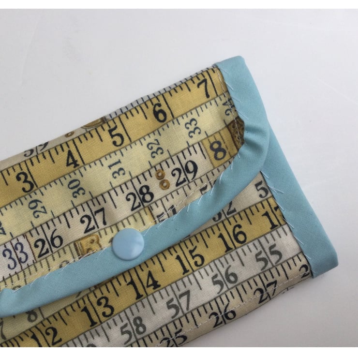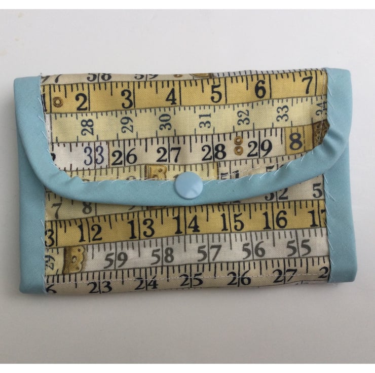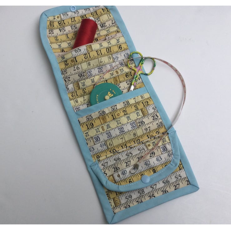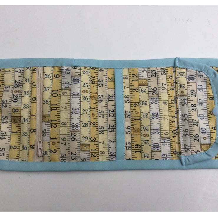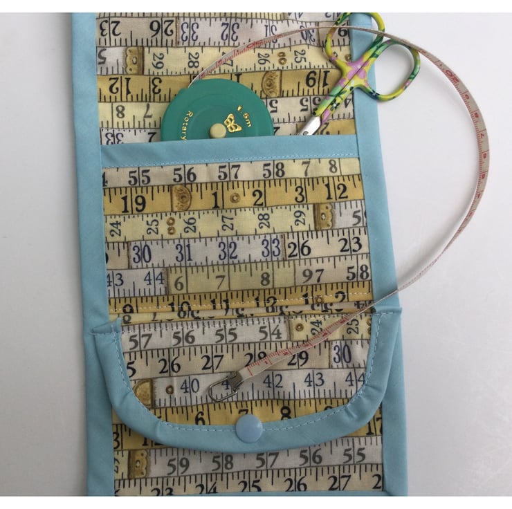 The sewing tidy comprises of a zipped pocket, an open pocket and a folded over button pocket trimmed with pale blue bias, so lots of room for all those useful little sewing necessities!