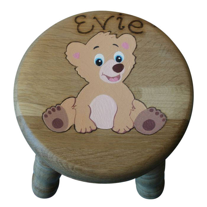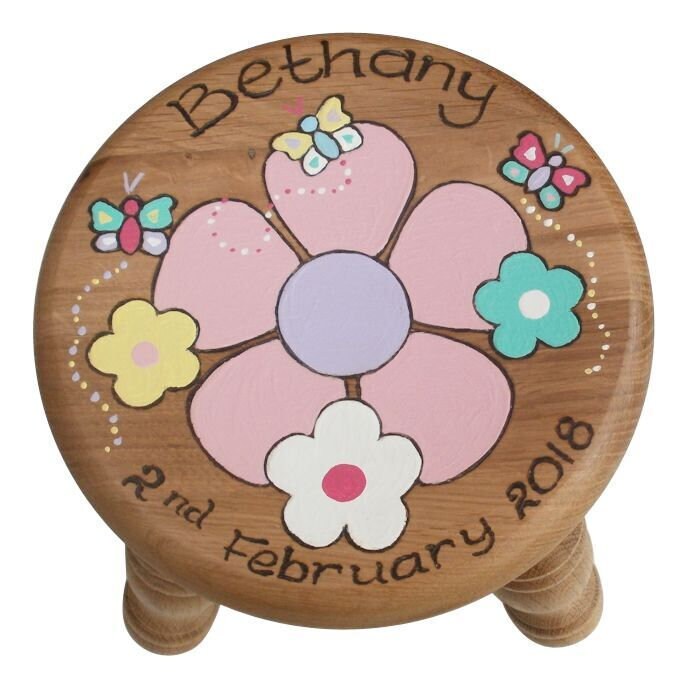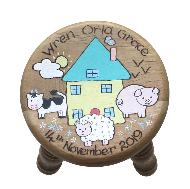 This chunky solid oak wooden stool is based on a traditional milking stool and is available in several different designs as shown in the images, the stool is also available with no design. The stool has 4 turned legs, a chunky turned seat and is hand finished with natural beeswax to enhance the beauty of the grain. Each stool is unique with hand painted designs and personalisation.