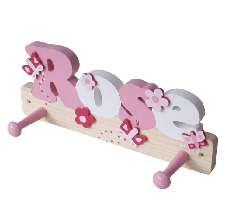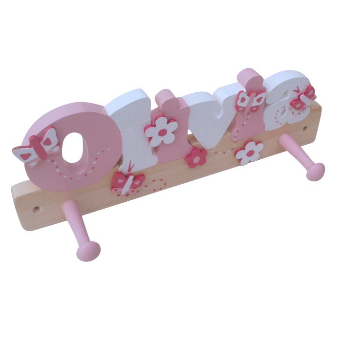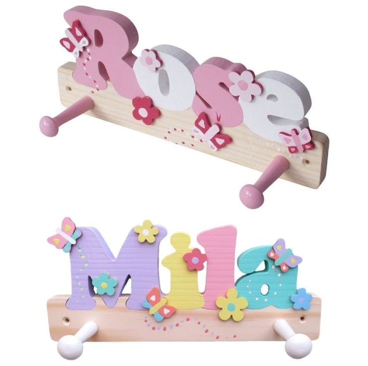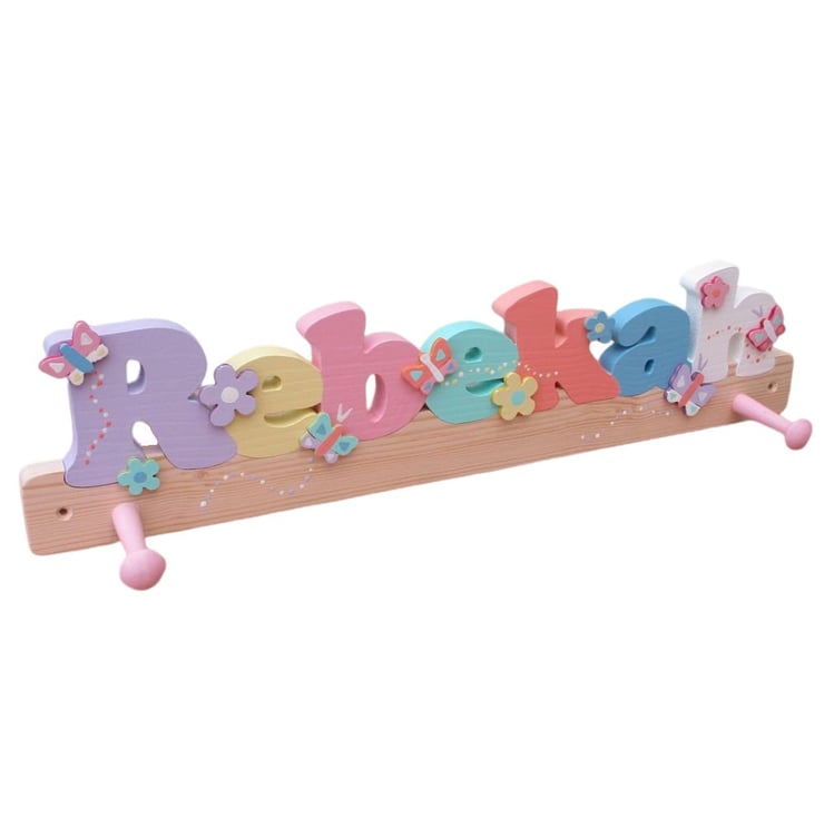 These handmade coat hooks for girls are made from solid pine and are hand painted in either pastel colours or pink and white colours. The coat hooks are decorated with butterfly and flower cut outs on the front and also have 2 well spaced shaker pegs. There is also the option of having just the name with no cut outs on the front.