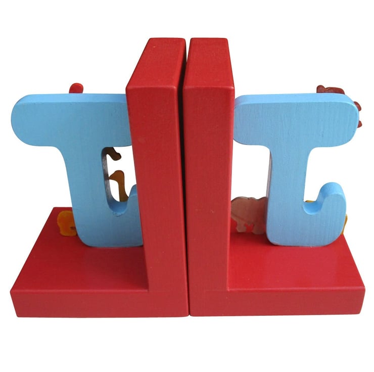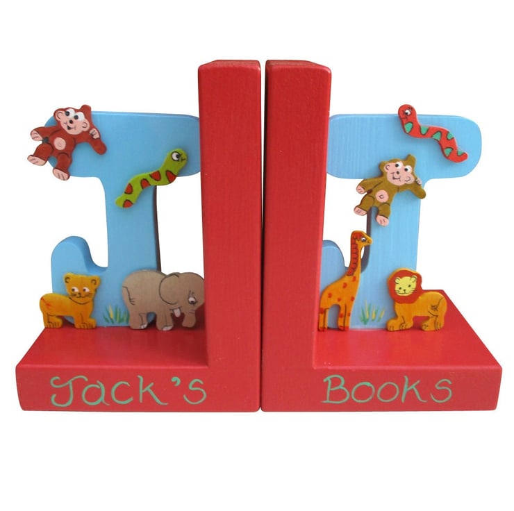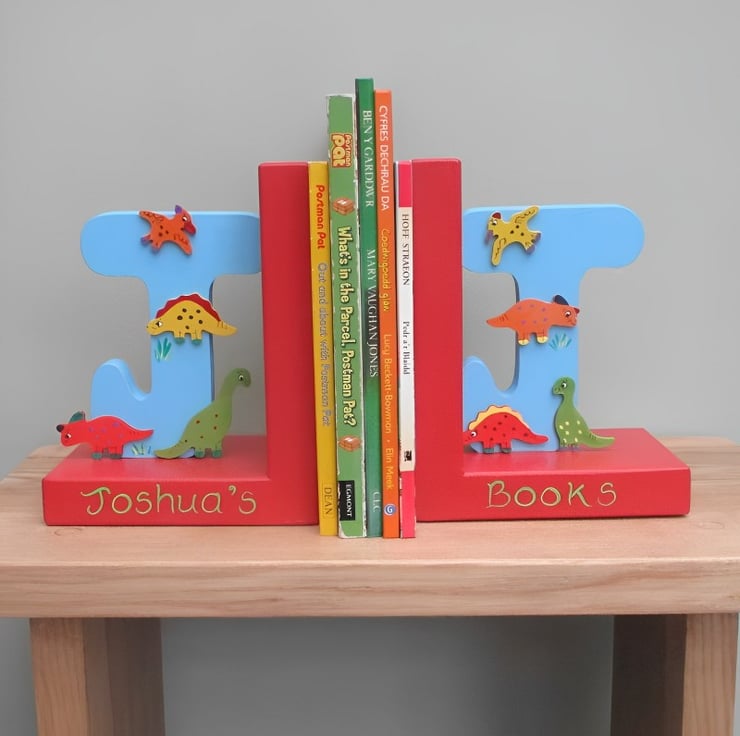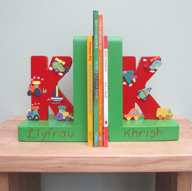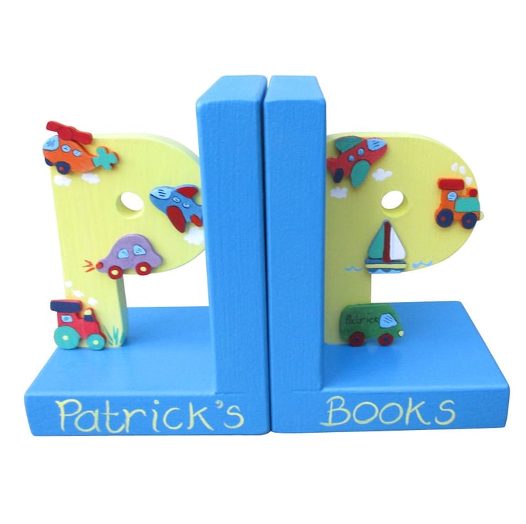 Chunky wooden initial bookends for boys which are hand painted in bright colours. There is also a choice of different design cut outs that we can add to the bookends as shown in the images. The front of the bookends can be personalised (if required).