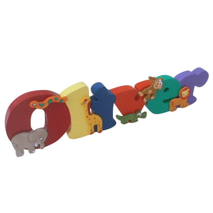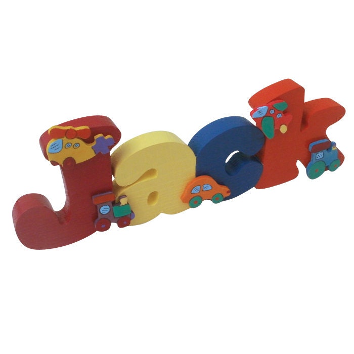 These hand made wooden names are hand painted in bright colours and then decorated on the front in a choice of different designed cut outs giving a 3 dimensional effect. There is also the option of having just the name with no cut outs on the front. They are thick enough to stand on a shelf in a boy's bedroomplayroom or they can be used as door plaques.