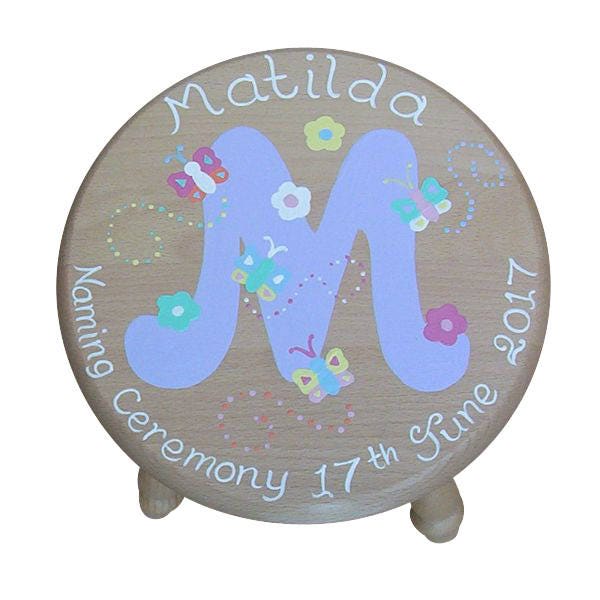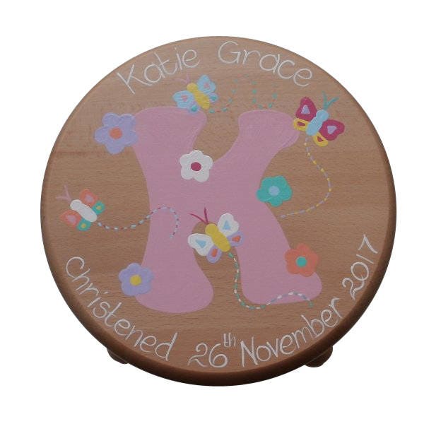 These solid beech wooden round four legged stools are a variation on our other stools for girls and boys. We hand paint a pink or lilac letter for girls and then add butterflies and flowers to enhance the design. The personalisation around the stool is hand painted in white.