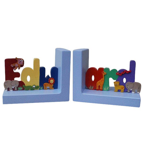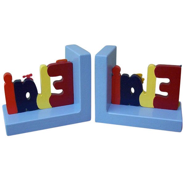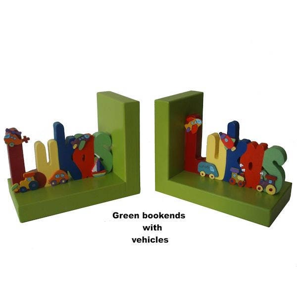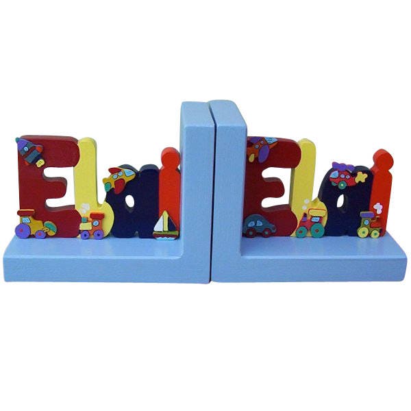 These chunky hand painted name bookends are decorated in a choice of themed cut outs (see design drop down box below) . You also have the option of the just the name with no cut outs. Any name made up to 10 letters, the bookends are made depending on the number of letters required, as a general rule names of 6 letters and up are split either side and names of 5 letters and under are added on each bookend.