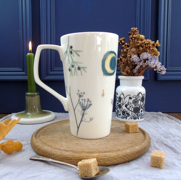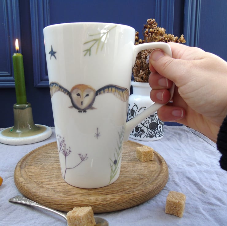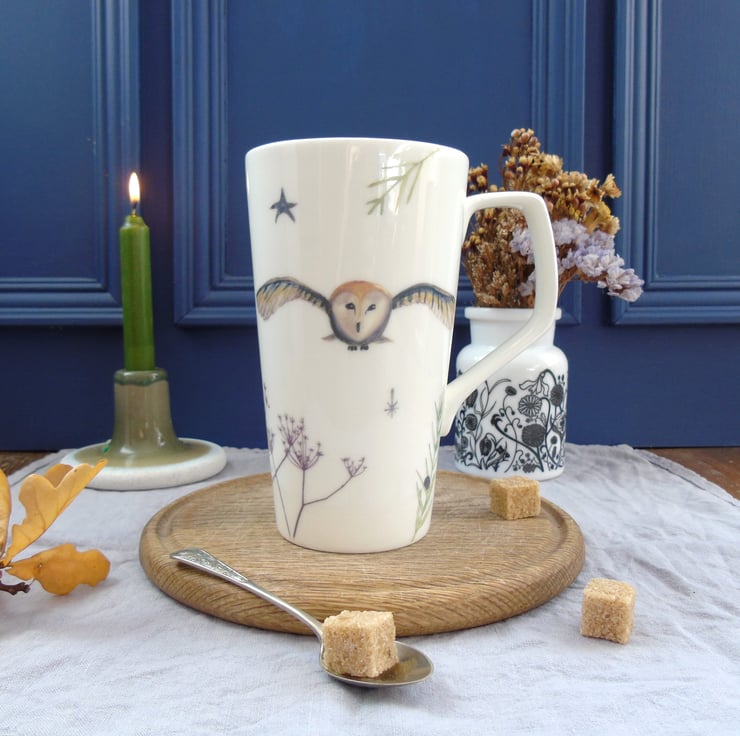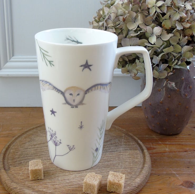 A generous sized bone china tall mug decorated with my illustrations of a magical barn owl flying above winter seed heads by the light of the full moon.