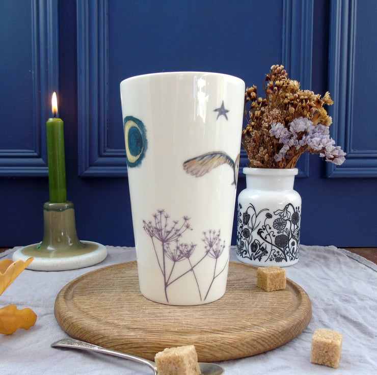 This tall, cone shaped bone china latte mug is hand decorated with ceramic transfers of my watercolour paintings, an elegant way to take your morning coffee or mid afternoon break with a slice of cake.