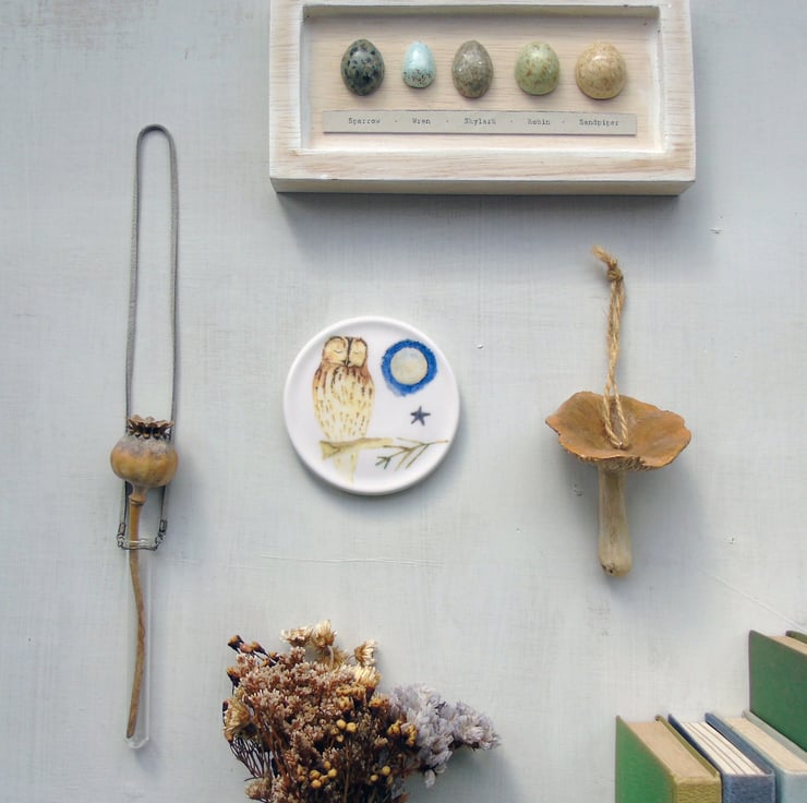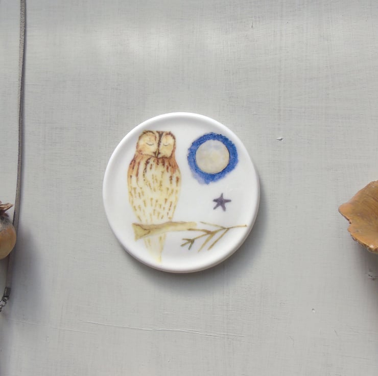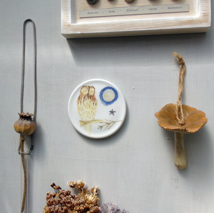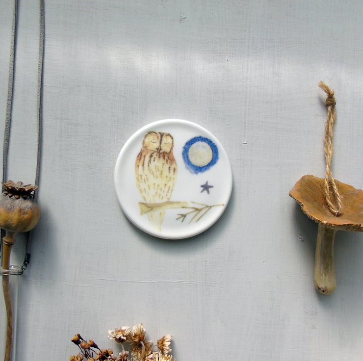 My watercolour painting of a sleepy tawny owl, moon and stars are made into ceramic transfers and then applied by hand to each mini bone china plaque. The decorative hanging plates are then fired to 800c meaning the designs will not scratch or fade even in direct sunlight.