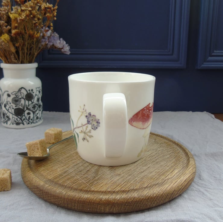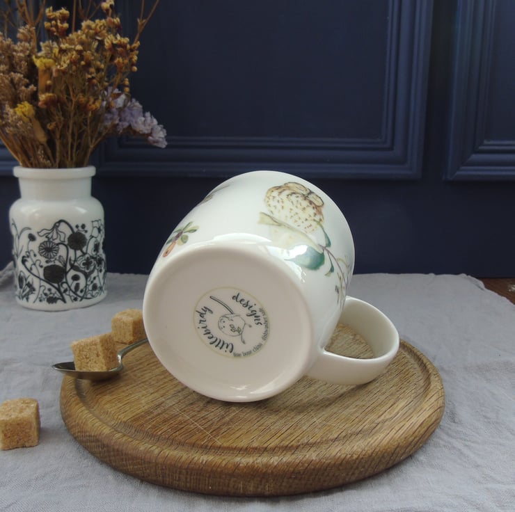 A pretty yet practical mug. My watercolour paintings of a sleepy tawny owl, toadstools, berries and foliage have been professionally printed onto ceramic transfers which are cut and applied by hand to create the finished design. .