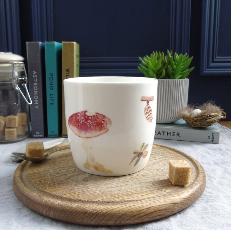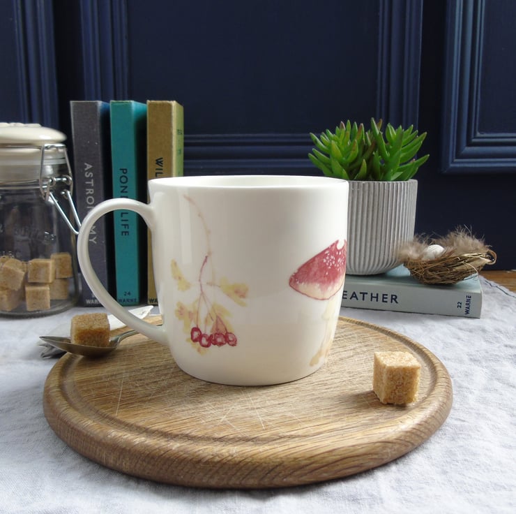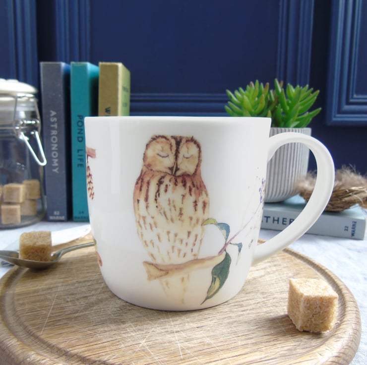 A pretty yet practical mug. My watercolour paintings of a sleepy tawny owl, toadstools, berries and foliage have been professionally printed onto ceramic transfers which are cut and applied by hand to create the finished design. .