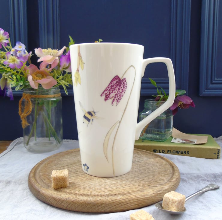 bone china tall mug hand decorated with ceramic transfers featuring my watercolour paintings of spring flowers and bees. A great gift for gardeners.