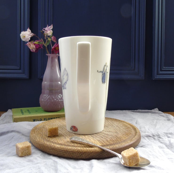 bone china tall mug hand decorated with ceramic transfers featuring my watercolour paintings of cottage garden summer flowers. A great gift for gardeners.