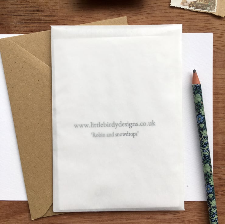 Season's Greetings message on the front of the card, blank inside for your own message. Comes with a natural kraft envelope presented in a plastic free, compostable glassine bag and sealed with a littlebirdy designs sticker. Packaged in a hard backed envelope to protect during postage.