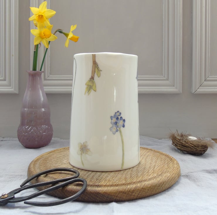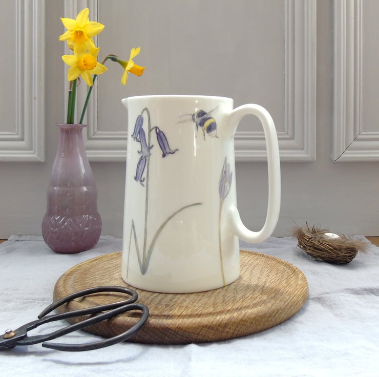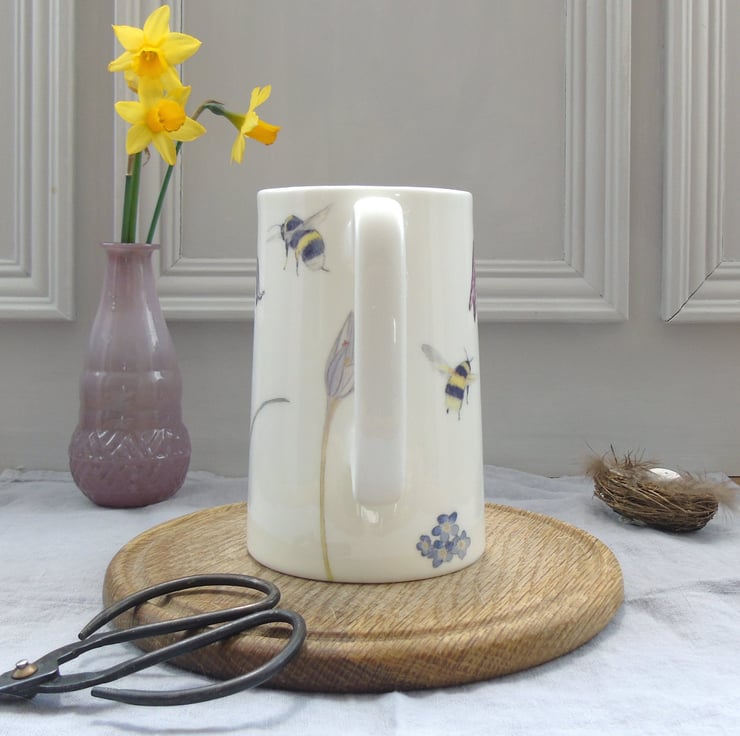 Hand decorated using ceramic transfers of my watercolour illustrations, of spring flowers and bees. My illustrations are professionally printed onto ceramic transfers then cut and applied to the jugs by hand, making each one special and unique.