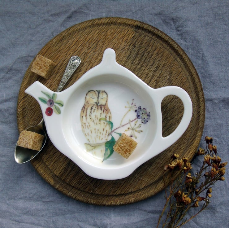 Hand decorated china teabag holder with tawny owl and ivy berries design in the shape of a teapot. The perfect gift for tea and wildlife loving friends!