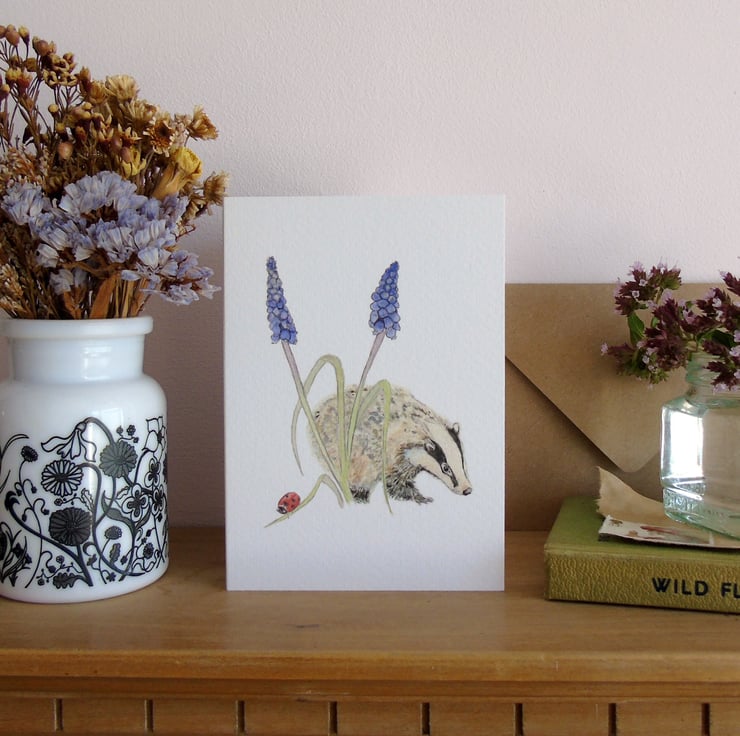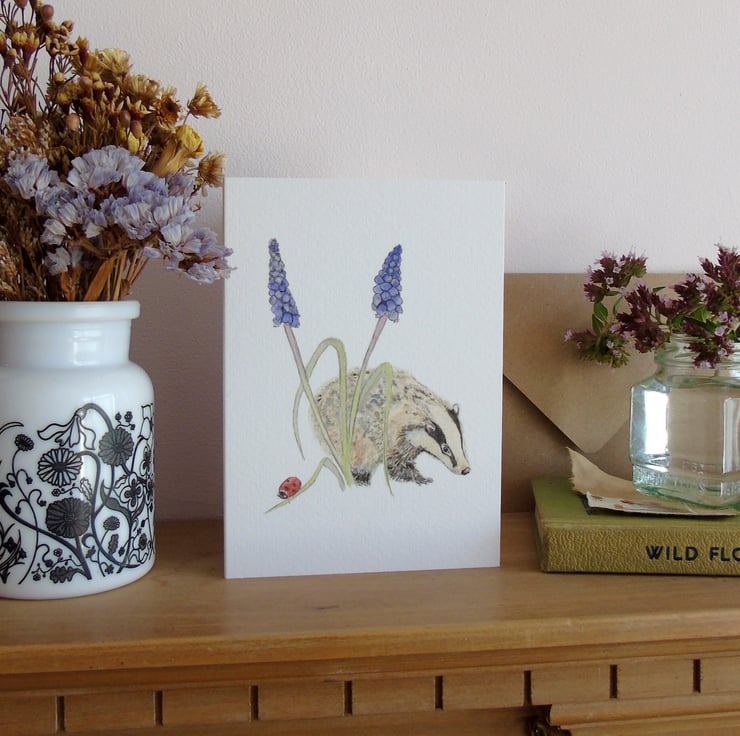 My watercolour painting of a badger and ladybird printed onto tintoretto gesso card stock for a luxurious feel. Would make a lovely card for nature lovers.