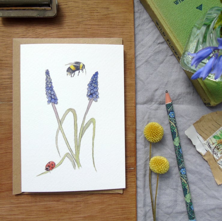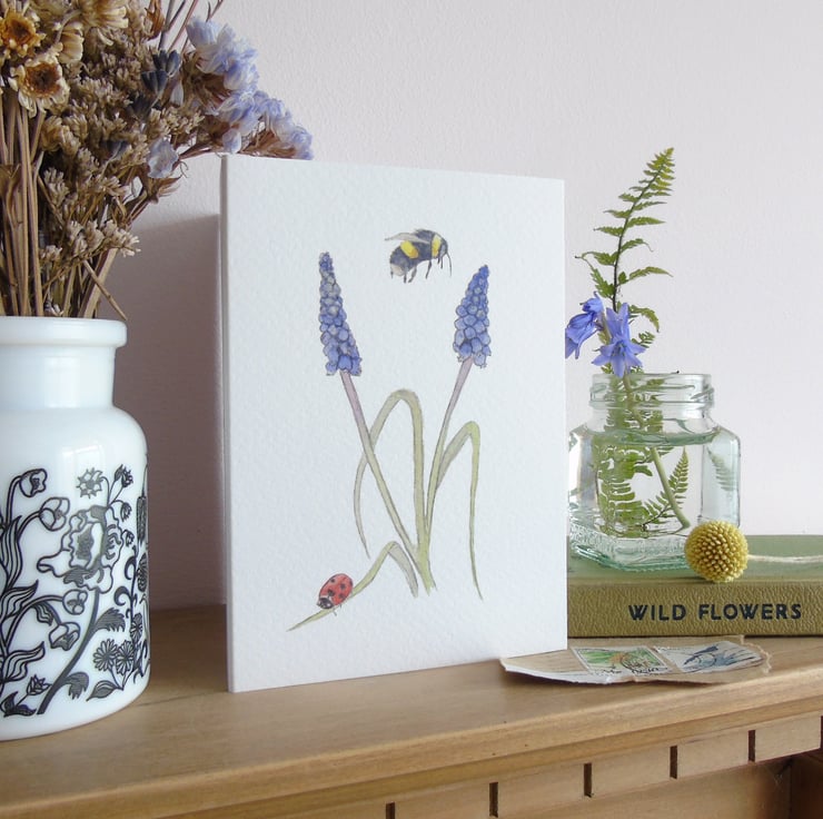 My watercolour painting of a ladybird, bee and grape hyacinth printed onto tintoretto gesso card stock for a luxurious feel.