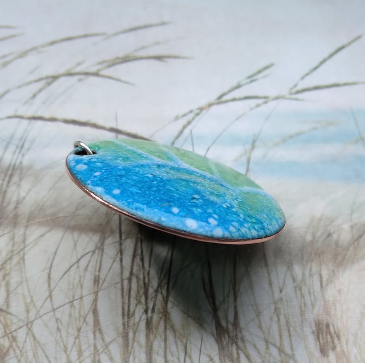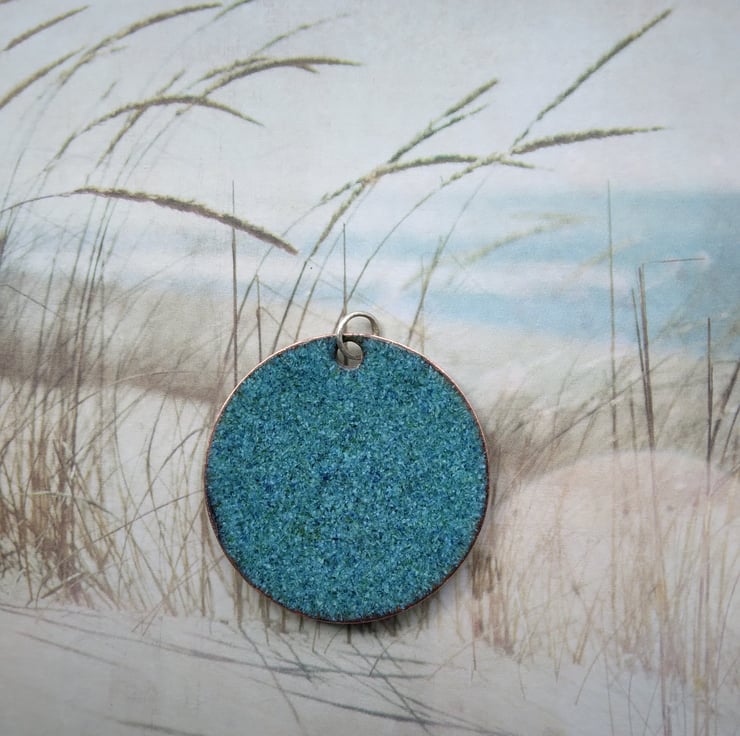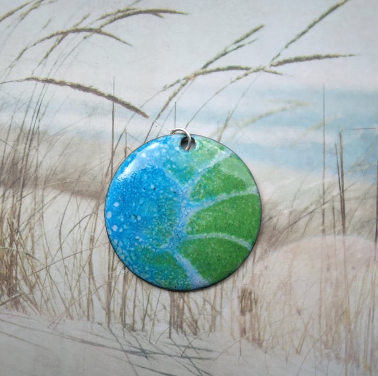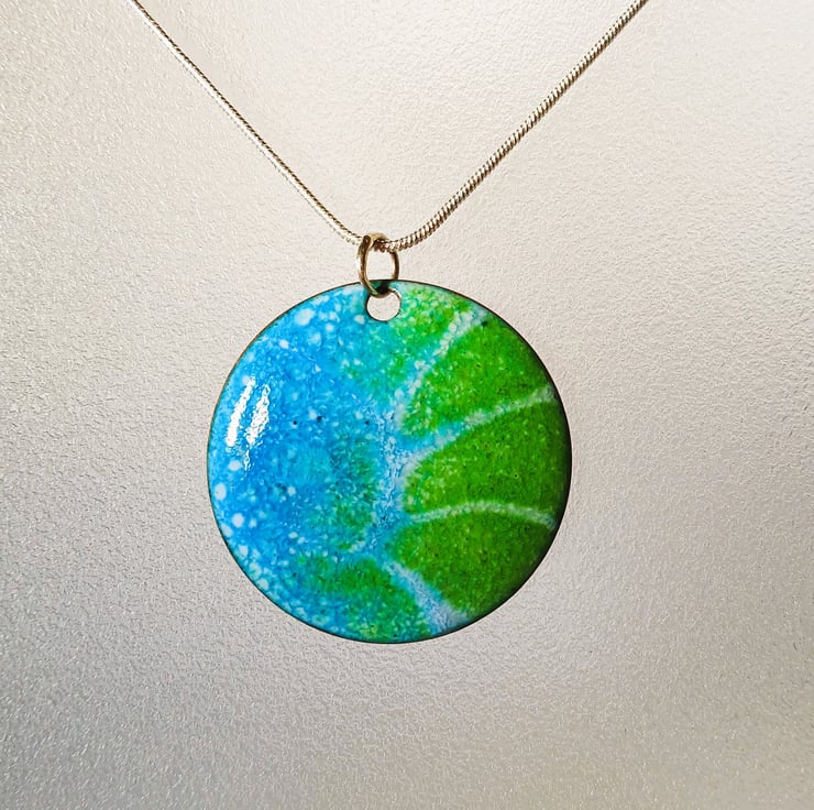 Large, domed enamelled copper pendant in blues, greens and lavenders. The pendant has been kiln-fired and measures approximately 35mm in diameter. The back has been enamelled to give a lovely greeny-blue tweed effect, for comfort against your skin as well as aesthetics. The edges have been left in their natural copper, and their shine can be maintained with gentle buffing. It comes complete with a soldered sterling silver jump ring and is supplied with an 18" silver plated snake chain and a little organza pouch.