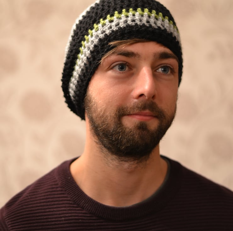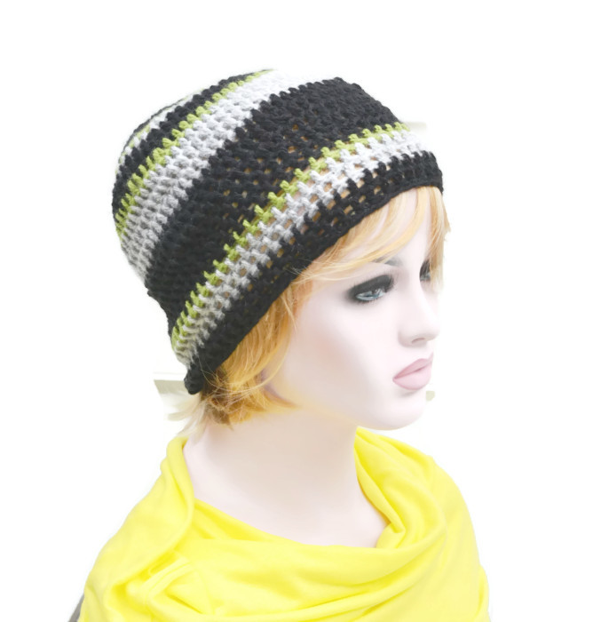 Clearance sale crocheted tam slouch hat in black, grey and pea green.
