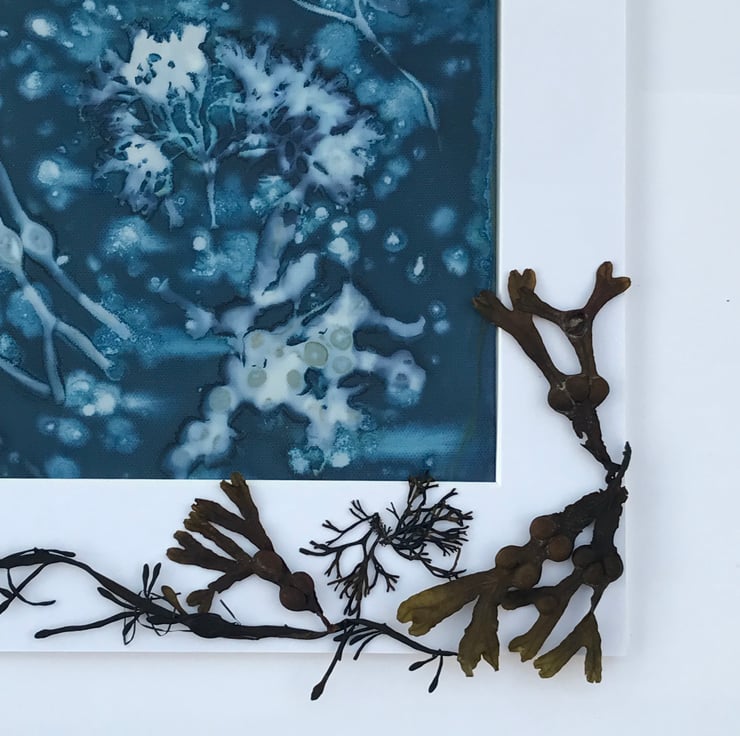By using the Wet Cyanotype technique on photo printing paper and canvas, the finished photograms have almost three-dimensional qualities and show the intricacies of the seaweed’s tender fronds and air bladders as if they are alive and freely floating.
