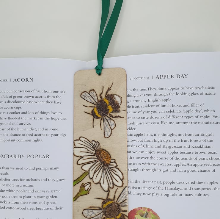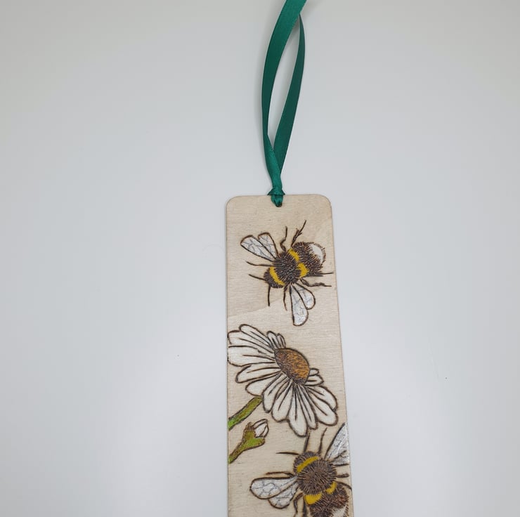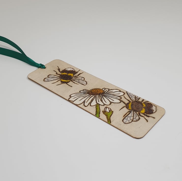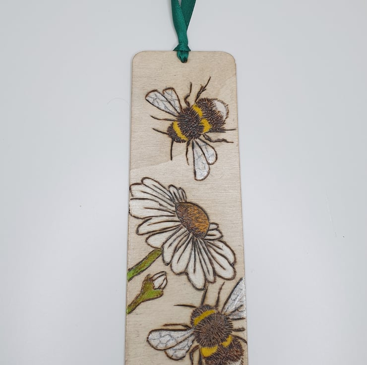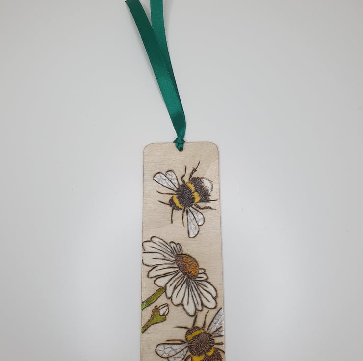 Bumble bees and daisies have been handburnt onto this wooden bookmark using the art of pyrography. The bookmark has then been coloured using acrylic paints to bring it to life. Several coats of satin varnish have been applied to the bookmark for protection and it has been finished with green satin ribbon.