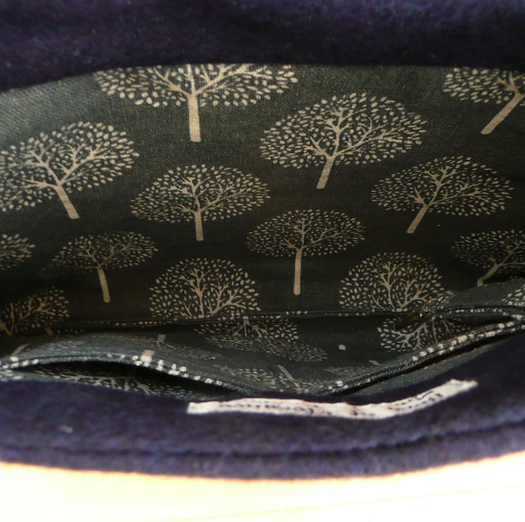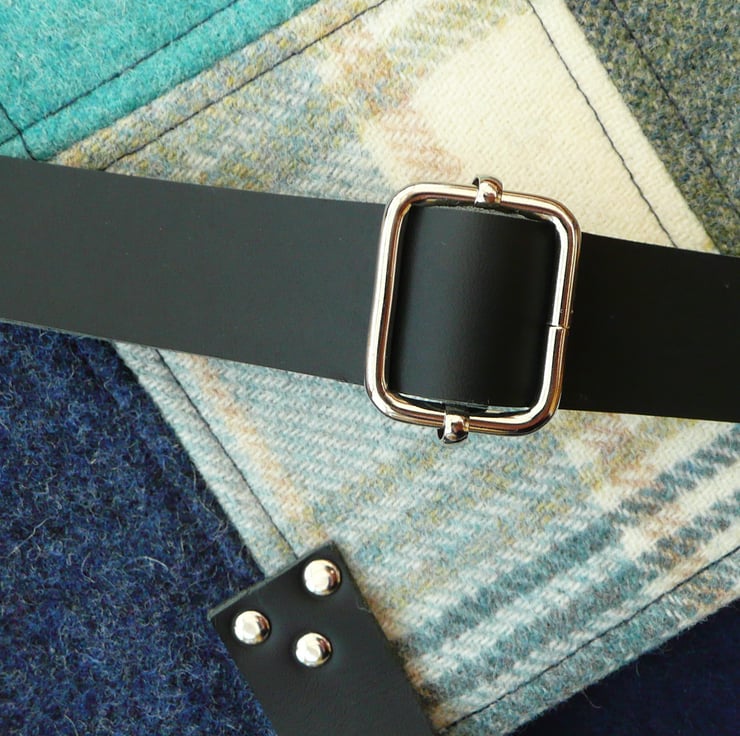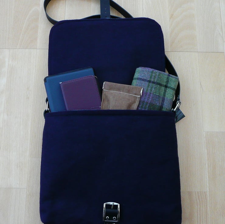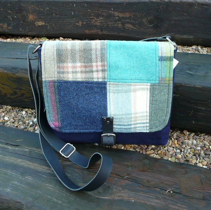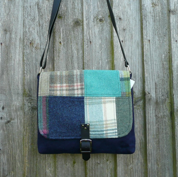 Made from a mixture of British wool tweed, ( mainly Abraham Moon ) this cross body bag features a patchwork over flap, a navy blue wool tweed main bag, black leather buckel fastener on the front and a a long adjustable black leather crossbody strap. This bag is made with lots of interfacing and wadding to create stability and durability. Inside the bag is fully lined in grey and ecru mulberry tree linen with 2 slip pockets and a key clip, all bag hardware is in silver nickel colour.