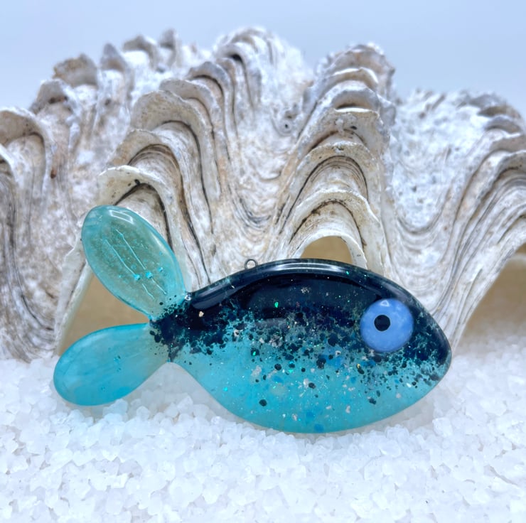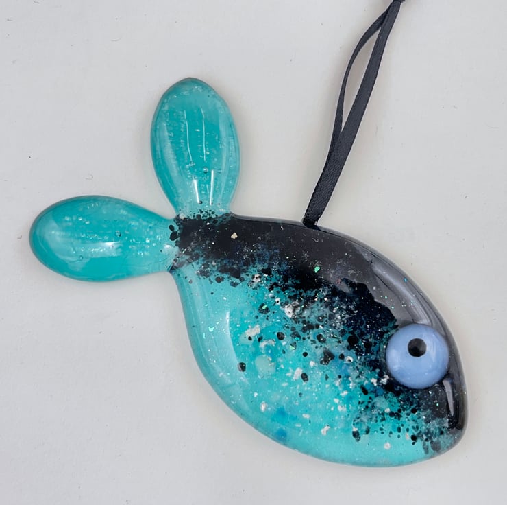 Created with Bullseye sheet, accessory and dichroic glass in my Whitstable workshop. The body, eye and fins are all hand cut and fused separately before being joined in another firing with the hanging wire secured in place. Final adjustments are made to the shape and then the whole piece is fired again. The iridescent green tail has a delicate ribbed effect. A black satin ribbon is attached to complete the design.