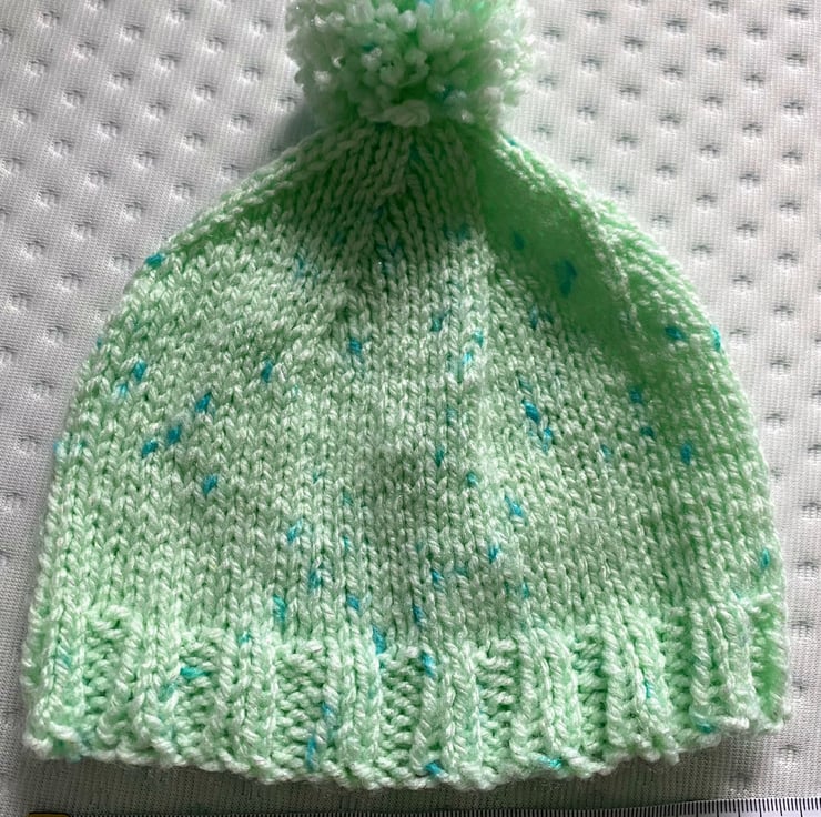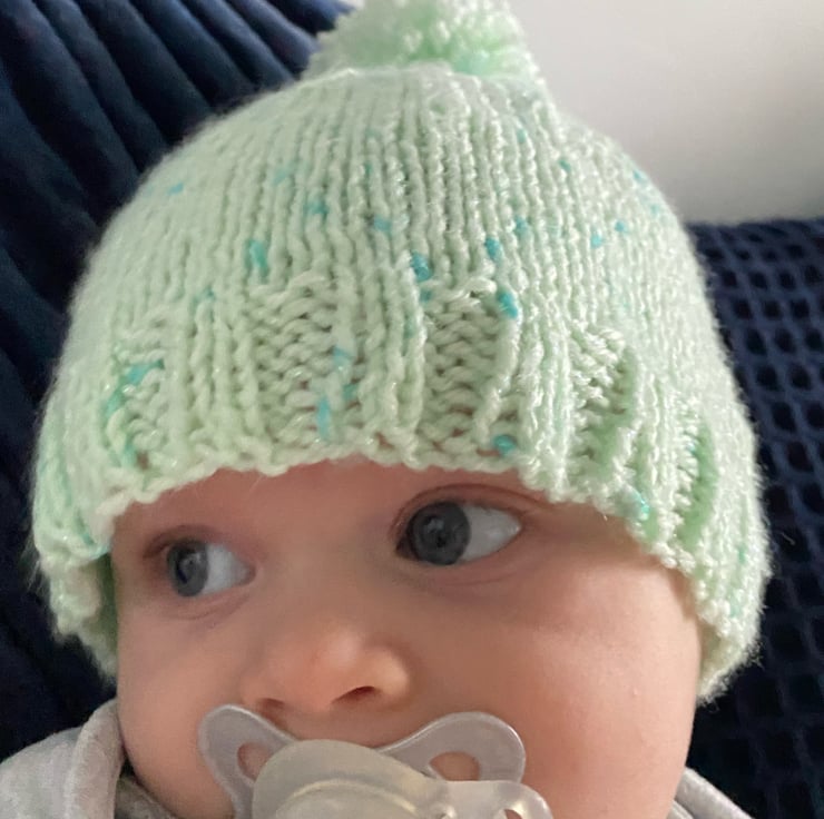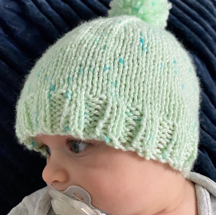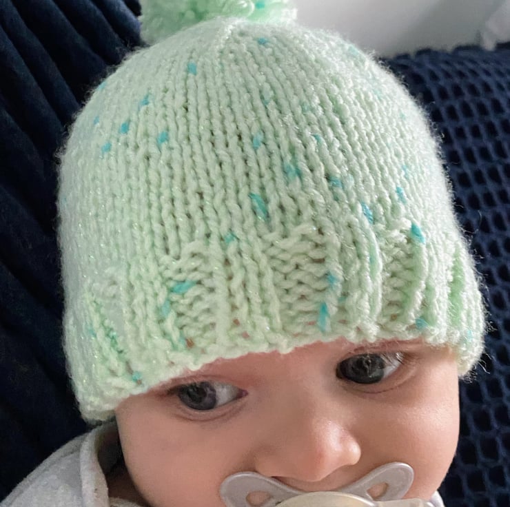 Unique hand knitted baby hat. Made with sparkly teal / pale turquoise acrylic yarn. Soft and comfortable, lightweight. To fit 2-4 months approx. Baby shown is 3 months.